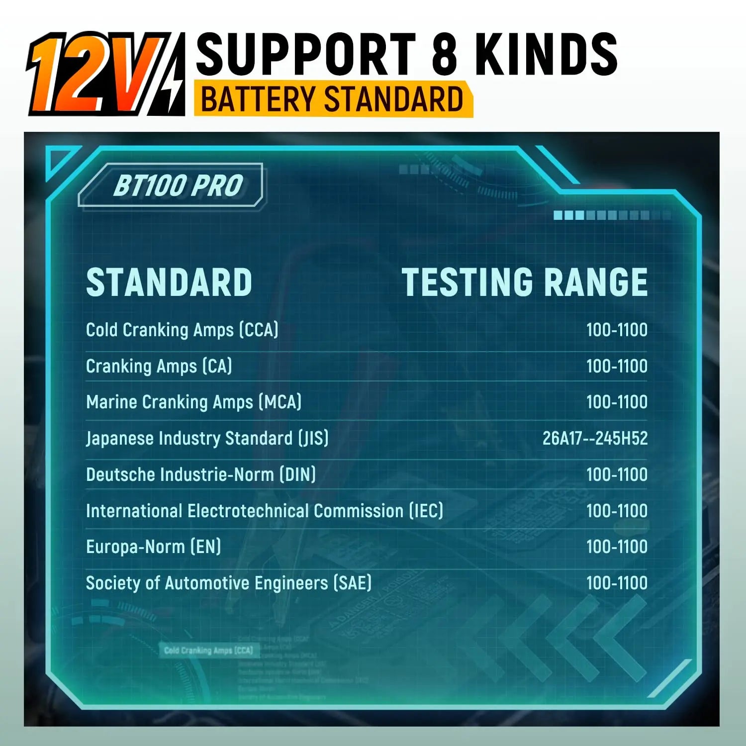 De Foxwell BT100 Pro 12V Auto Accutester is een compacte, professionele accugezondheidsanalysator ontworpen voor 12V loodzuuraccu's. Hij ondersteunt overstroomde, AGM platte plaat, AGM spiraal en GEL accu's, met testen van 100–1100 CCA en tot 200 Ah. In ongeveer 3 seconden levert hij duidelijke resultaten die u helpen de accugezondheid te verifiëren, fouten te detecteren en de laadstatus te beoordelen, waardoor u pech langs de weg voorkomt en de levensduur van de accu verlengt. Aangedreven door de te testen accu, beschikt hij over een groot verlicht LCD-scherm en een intuïtief toetsenbord voor moeiteloze bediening. Hij biedt bruikbare resultaten en aanbevolen vervolgstappen, inclusief accugezondheidsstatus, interne weerstand, SOC- en SOH-waarden en foutdiagnoses. Veilig, betrouwbaar en vonkvrij, ideaal voor technici en doe-het-zelvers.