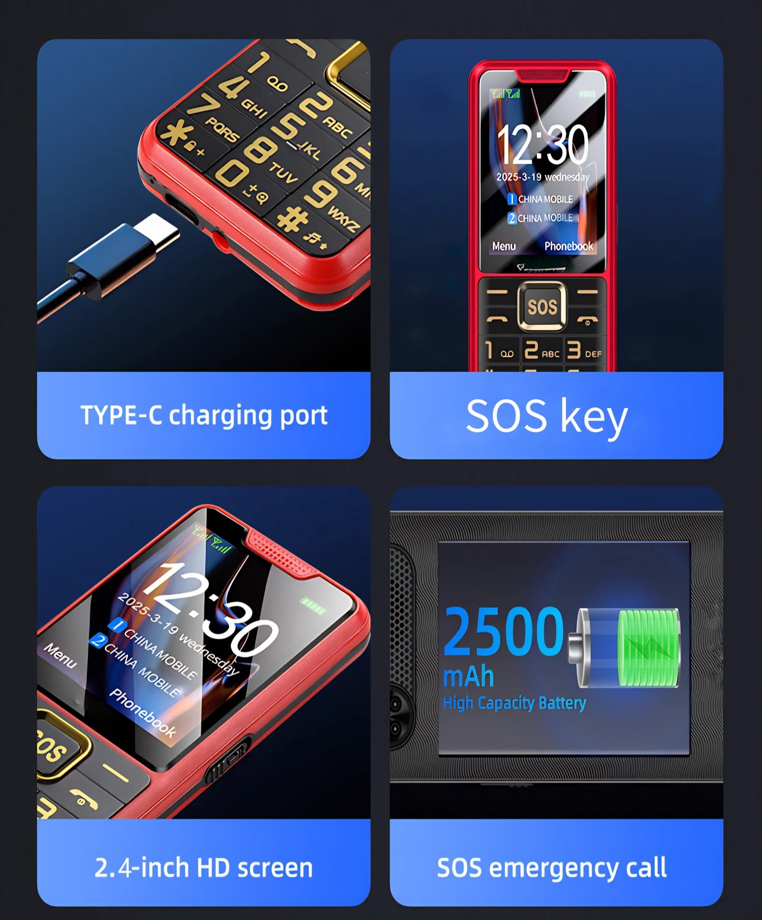 GSM 2G Ontgrendeld Ouderen Drukknop Telefoon – Dual SIM SOS Toets is een eenvoudige, betrouwbare mobiele telefoon ontworpen voor senioren die grote knoppen, Dual SIM gemak en een SOS-toets voor noodgevallen nodig hebben. Compact, eenvoudig te bedienen en gericht op essentiële bel- en veiligheidsfuncties.