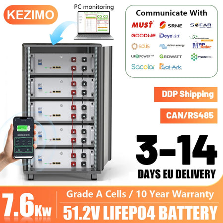 Maak kennis met de KEZIMO LiFePO4 Batterijset, een betrouwbare thuisenergieopslagoplossing die is ontworpen voor stabiele, veilige stroom wanneer u die het meest nodig heeft. Gebouwd rond LiFePO4-chemie, levert deze 51,2V-set betrouwbare prestaties, een lange levensduur en flexibele integratie met moderne omvormers. Met Bluetooth-compatibele BMS en CAN/RS485-communicatie kunt u uw energieopslag eenvoudig monitoren, beheren en opschalen vanaf uw favoriete apparaten.