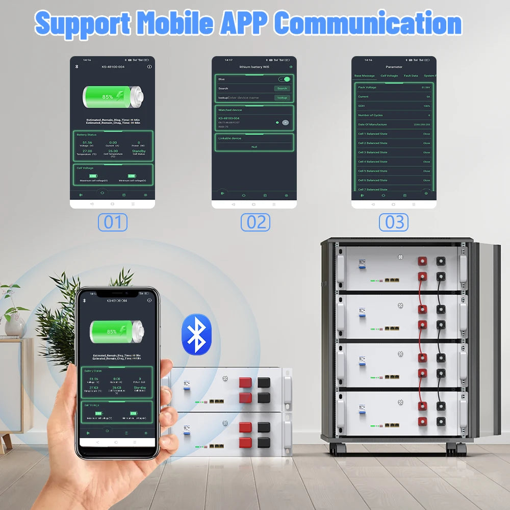 - Slimme monitoring: Bluetooth-compatibele BMS met CAN/RS485 maakt het mogelijk om batterijgegevens in realtime op afstand te monitoren via een mobiele app en eenvoudige integratie met compatibele omvormers.