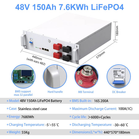 KEZIMO LiFePO4 Batterijpakket 51.2V 150Ah 7.68kWh Met Bluetooth BMS RS485 CAN 6000 Plus Cycli