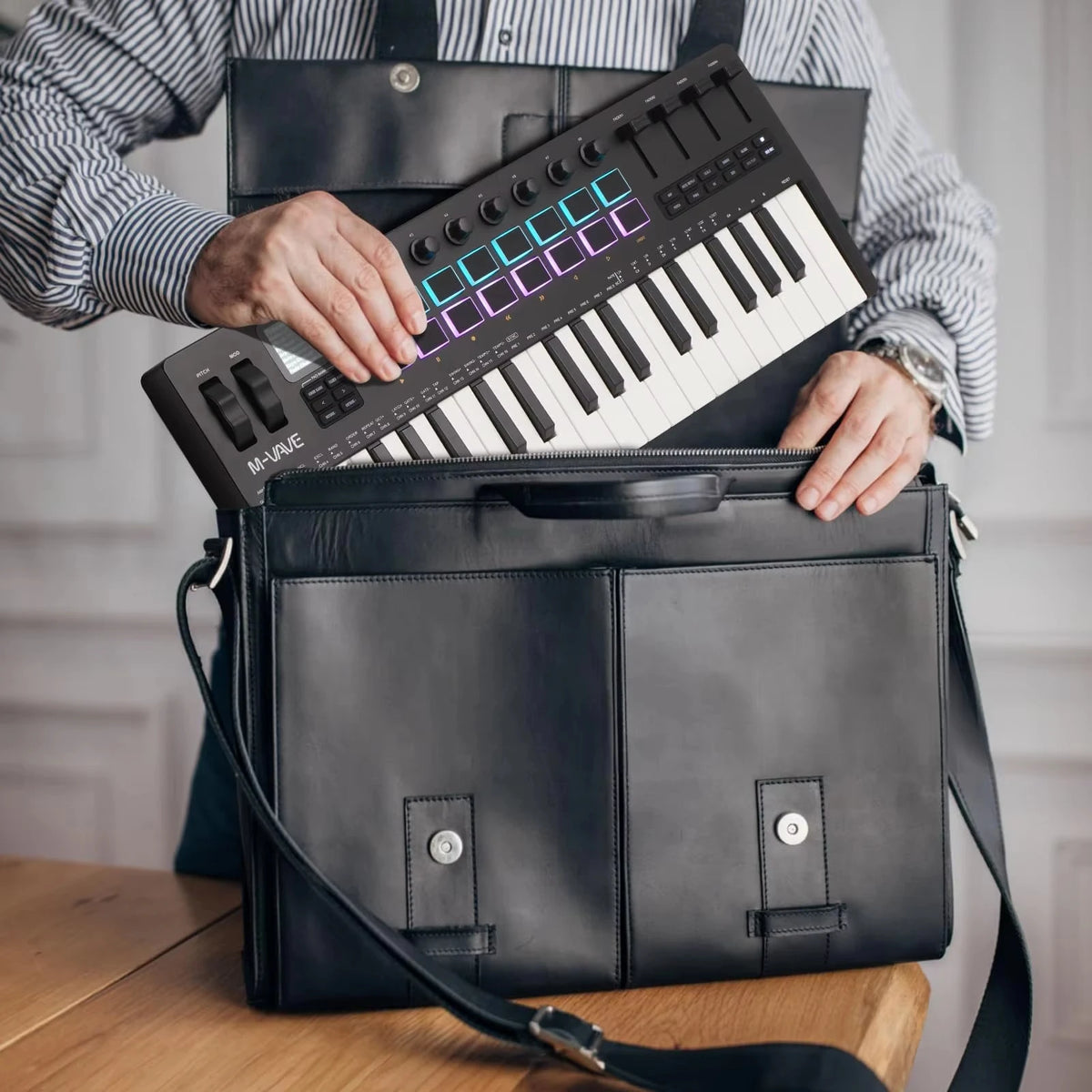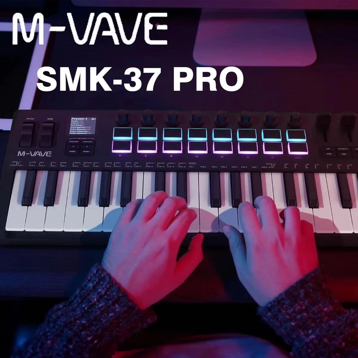 Ontmoet het M-VAVE SMK 37 Pro MIDI Keyboard, een veelzijdige 37-toets draadloze controller gebouwd voor producenten en artiesten die draagbaarheid verlangen zonder controle op te offeren. De velocity-gevoelige toetsen met een veerbelaste actie leveren een natuurlijk, expressief speelgevoel dat ideaal is voor alles van pianolijnen tot levendige synth-riffs.