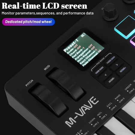 Het ontwerp is gebruiksvriendelijk en duurzaam, met een 1,54-inch display, achtergrondverlichte siliconen knoppen en fysieke modulatie-/pitchwielen voor snelle expressieve controle. Gemaakt van stevig ABS-materiaal en aangedreven door een oplaadbare 2000 mAh batterij, is dit draagbare keyboard klaar om je van studio tot podium te vergezellen.