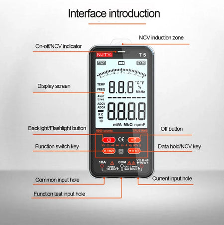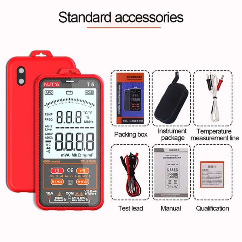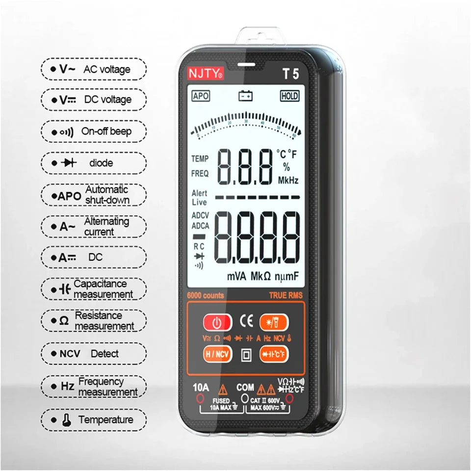 Maak kennis met de Precision Digital Multimeter 6000 Counts 0.8 Tot 600V AC DC ā een compact, betrouwbaar hulpmiddel ontworpen voor elektronica-enthousiastelingen, doe-het-zelvers en professionals. Het meet AC- en DC-spanning van 0.8V tot 600V, AC-stroom van 6mA tot 10A en DC-stroom tot 10A. De maximale weergave van 6000 tellingen en de verlichte LCD zorgen voor duidelijke aflezingen in elke verlichting. Ware RMS-prestaties leveren nauwkeurige metingen op niet-sinusvormige signalen, terwijl diode testen en NCV-detector het oplossen van problemen versnellen. Data hold helpt je om tijdelijke metingen vast te leggen, en een zoemer waarschuwt je wanneer de metingen stabiliseren. Auto range vereenvoudigt de bediening, zodat je je kunt concentreren op de taak die voor je ligt. Gebouwd door TIANSIQIB in het Chinese vasteland, combineert de DT9205A/T5 een compact formaat (156 x 77 x 19.5 mm) met veelzijdigheid voor reparatiewerk, elektronica-projecten en controles ter plaatse. Batterij niet inbegrepen.
