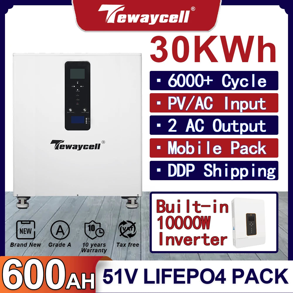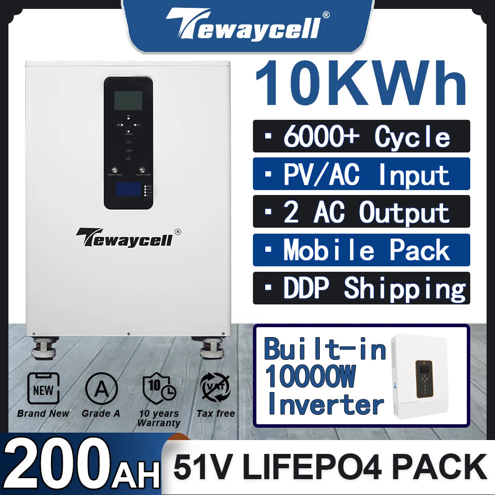 Tewaycell LiFePO4 Powerwall 20480Wh 51.2V 400Ah Batterijpakket Met Ingebouwde BMS 10kW Omvormer