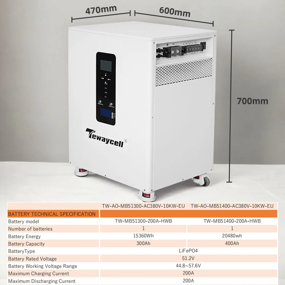 - Tewaycell LiFePO4 Powerwall-batterijpakket met ingebouwde BMS en 10kW-omvormer (Model TW-AO-MB51400-10KW-US)