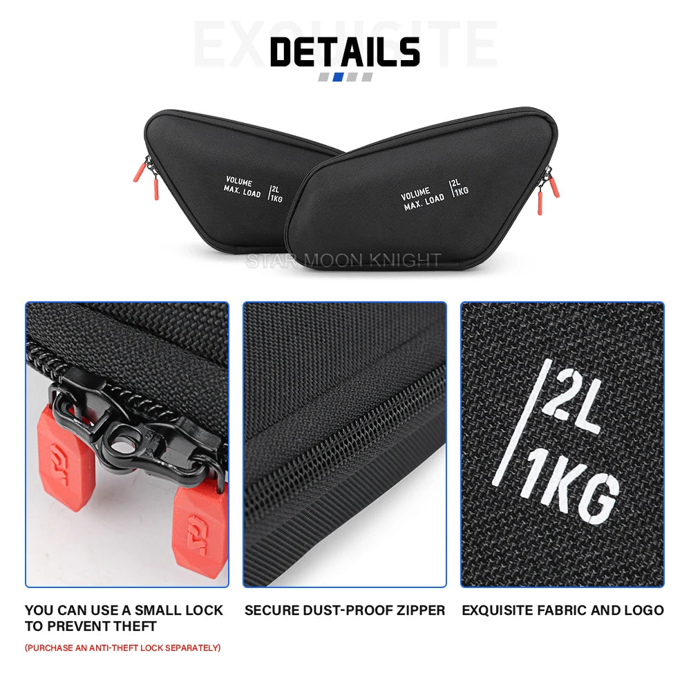 Upgrade de on-bike opslag van uw BMW R1300GS Adventure met de BMW R1300GS Adventure Side Frame Bag van Star Moon Knight. Gemaakt van waterdicht nylon, voegt deze eendproof zijtas betrouwbare opslag toe aan beide zijden van het achterframe, zodat u gereedschap, handschoenen, snacks en essentiële spullen kunt meenemen zonder het rijcomfort te verminderen. De robuuste waterdichte voering en interne grid houden items veilig en gemakkelijk bereikbaar, zelfs wanneer u de tas onderweg opent. De harde nylon constructie is duurzaam, sterk en bestand tegen verbleken, ideaal voor uitdagende trailomstandigheden. Een antislip, waterdichte rits beschermt tegen stof en vocht, terwijl een veilig installatiesysteem zorgt voor een stevige bevestiging aan uw motorfiets. Speciaal ontworpen voor de BMW R1300GS Adventure 2024- model, integreert het met het horizontale achterframe om de ruimte te maximaliseren zonder het silhouet van de motor te verstoren. Opmerking: Bevestig alstublieft dat dit product geschikt is voor uw motorfiets bij het plaatsen van een bestelling.