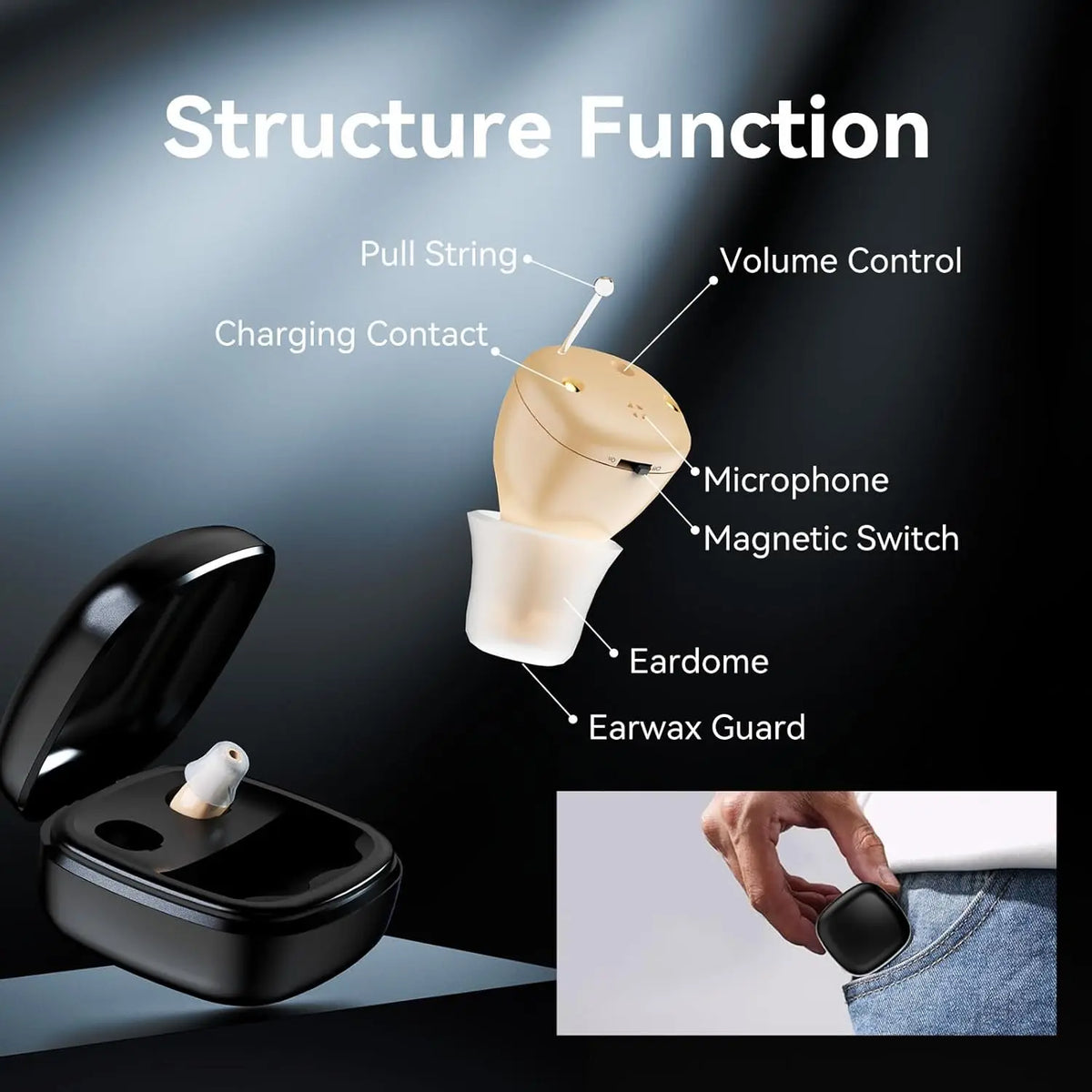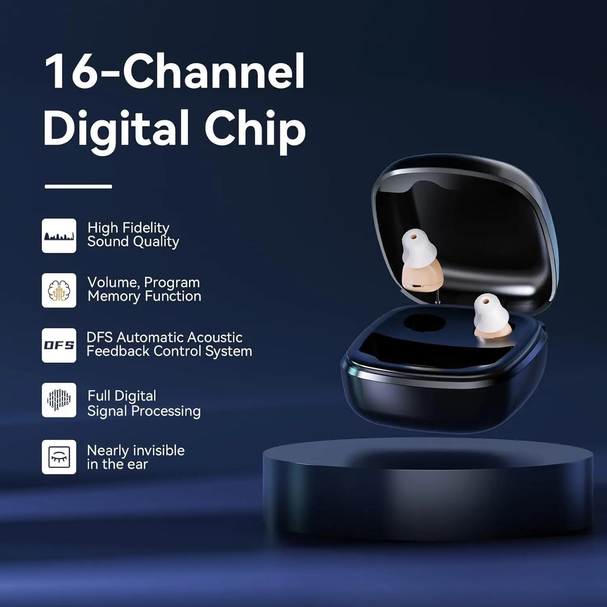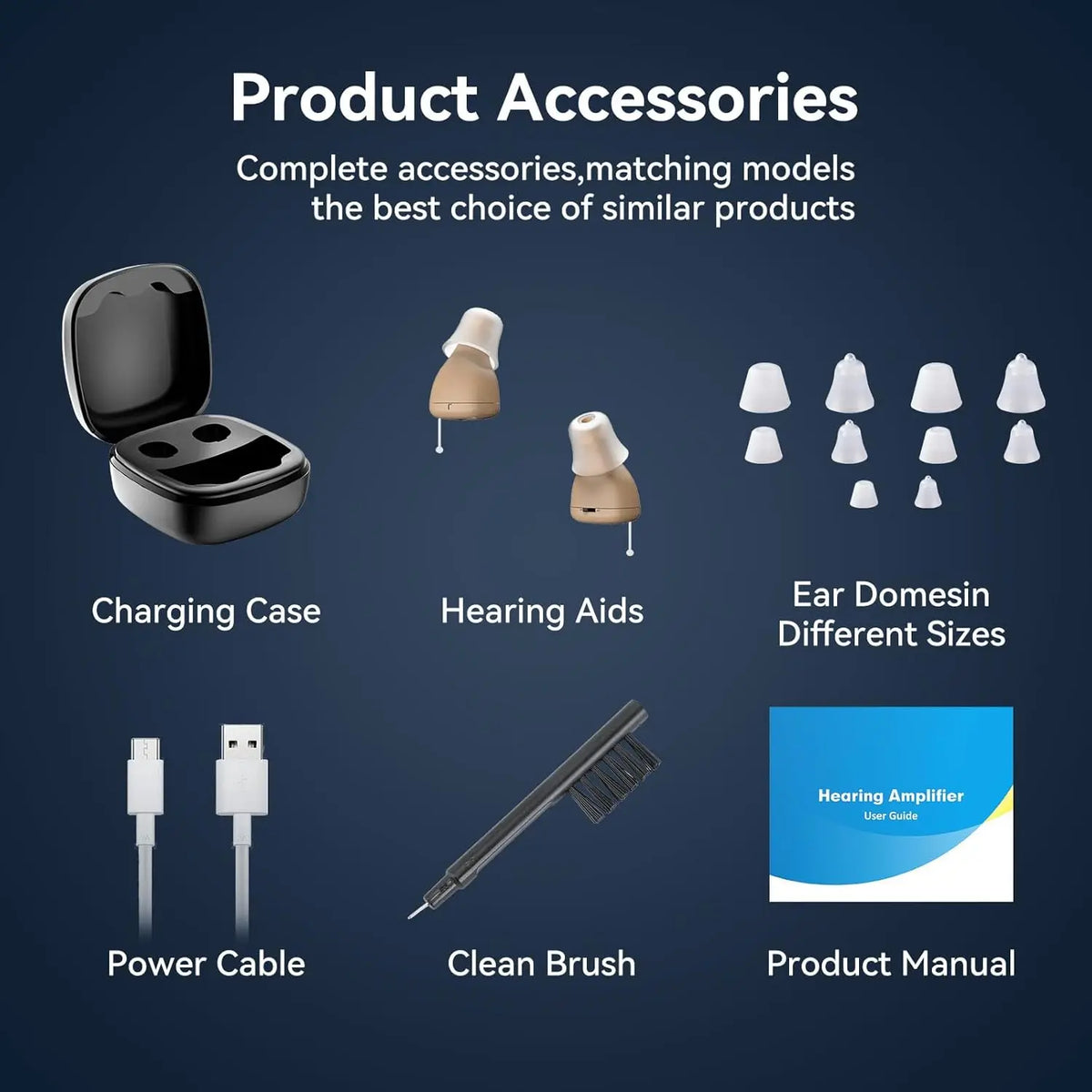 Oplaadbare CIC onzichtbare hoortoestellen met ruisonderdrukking en 3-niveaus volumeregeling, draagbare hoes