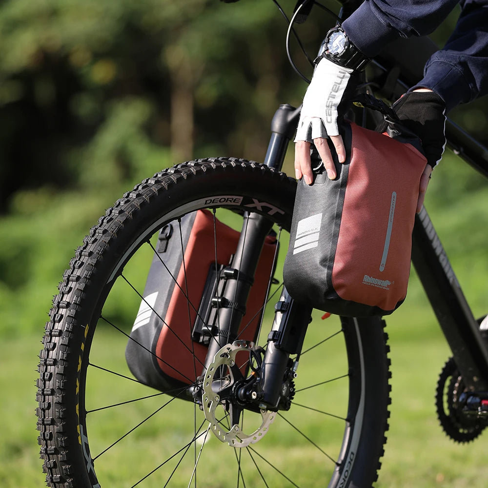 Rhinowalk RK404/406 Front Fork Bag Pair is de perfecte oplossing voor rijders die extra weerbestendige opslag nodig hebben zonder in te boeten op rijcomfort. Beschikbaar in 4L of 6L capaciteiten, zijn deze tassen ontworpen om veilig op de voorvork te monteren, zodat je essentiële spullen droog en binnen handbereik houdt tijdens elke rit. De naadloze RF-gelaste constructie en roll-top sluiting bieden betrouwbare IP64-niveau waterdichtheid wanneer deze goed is opgerold, zodat regen en spatten je uitrusting niet verpesten.