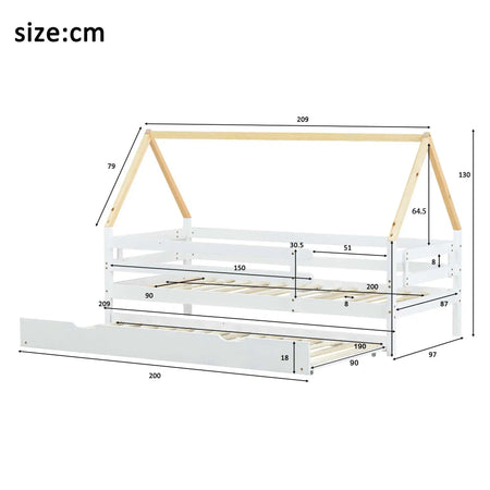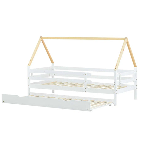 Ontdek een slimme en stijlvolle ruimtebespaarder met het Solid Wood Uittrekbaar Eenpersoonsbed Frame met Zwenkwielen en Opbergruimte 90x200. Gemaakt van FSC-gecertificeerd dennenhout en afgewerkt in een warme tweekleurige palette, combineert dit bed natuurlijke schoonheid met praktisch ontwerp. Het bovenste bedframe in natuurlijke kleur staat op een puur witte basis, wat een tijdloze uitstraling creëert die past in moderne of traditionele kamers. Het slimme uittrekbare bedbord onderaan maakt het gemakkelijk om gasten of broers en zussen te huisvesten zonder vloeroppervlak op te offeren. Gebouwd voor duurzaamheid, gebruikt de massieve dennenstructuur een driehoekig bovenframe voor extra stabiliteit, terwijl vierzijdige veiligheidsrails en een gebogen hekje kleine kinderen beschermen tegen uitglijden en stoten. Om de veiligheid te verbeteren, zijn schroeven discreet bedekt met stickers, waardoor nieuwsgierige handjes tijdens het spelen veilig blijven. Gemakkelijk te monteren met gedetailleerde instructies en complete onderdelen, verandert dit bed de montage in een snel, bevredigend project waar je van zult genieten.