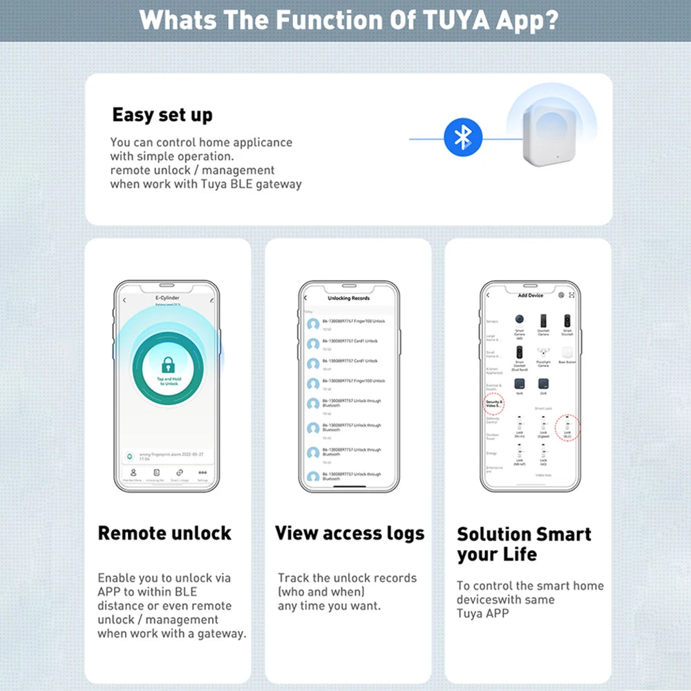 Dit slimme cilinderslot vereenvoudigt de toegangscontrole: elimineer verloren sleutels, geef tijdelijke codes en monitor toegang via Bluetooth/WiFi. Duurzame gepolijste constructie en betrouwbare vingerafdrukherkenning zorgen voor precisie en duurzaamheid voor dagelijks gebruik. Eenvoudig te installeren op standaarddeuren en omkeerbaar voor links/rechts.