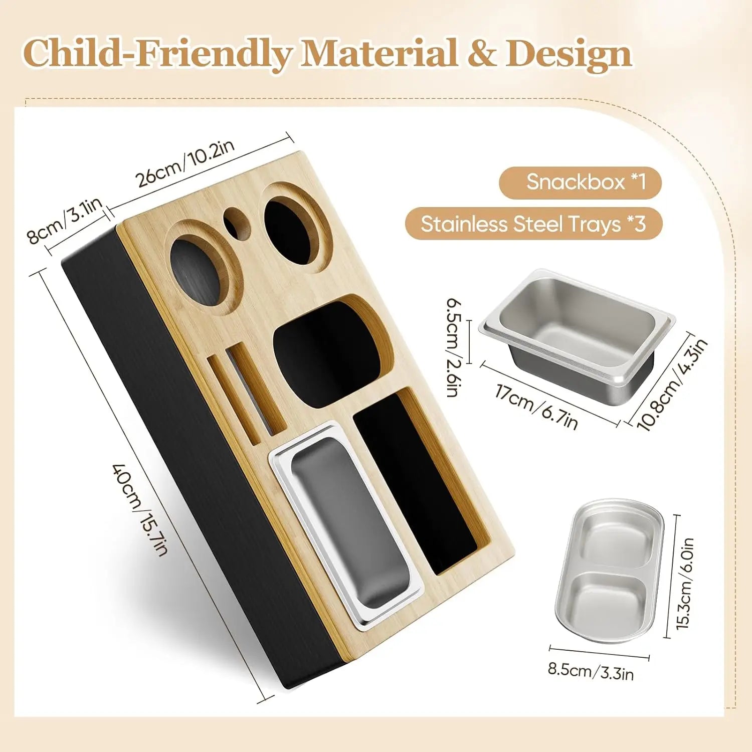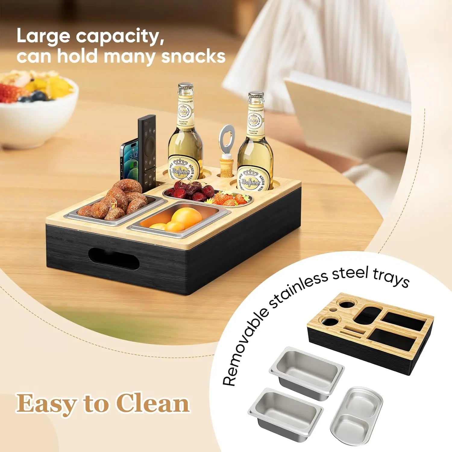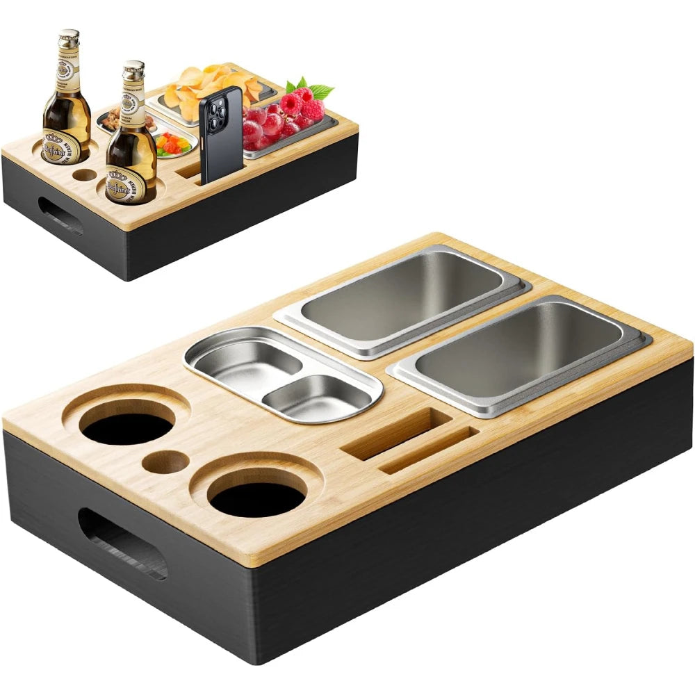 Slimme zitgenoot: de couch bar bevat 3 voedselveilige roestvrijstalen kommen voor snacks en fruit, plus 2 fleshouders (80 mm diameter) die passen voor flessen van 0,3 L–0,5 L. Het heeft ook 2 vakken voor afstandsbedieningen, flesopeners, mobiele telefoons en meer, zodat alles wat je nodig hebt binnen handbereik is.