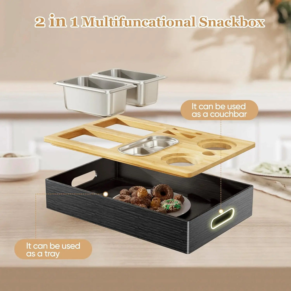 Handige ontwerpdetails: een afneembaar deksel dat met magneten aan de onderbak vastzit voor veilige opslag, en de onderbak fungeert ook als praktische serveerschaal. Dubbele zijhandvatten maken het gemakkelijk om het van de bank naar de tafel te dragen.