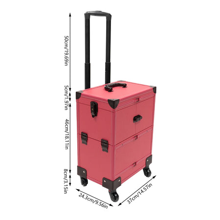 Een professionele rollende make-up trein koffer ontworpen voor artiesten en reizigers: duurzame PU-constructie, inklapbare lades voor georganiseerde opslag, veilige sloten en soepel rollende wielen voor gemakkelijke transport.