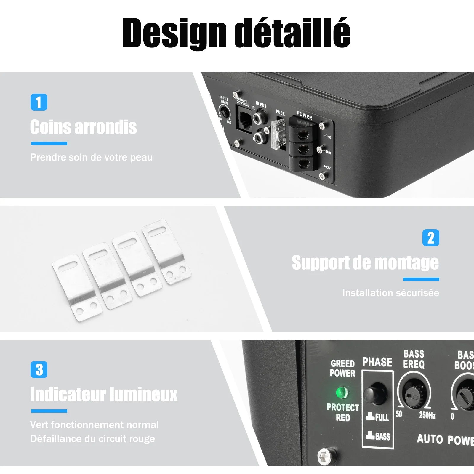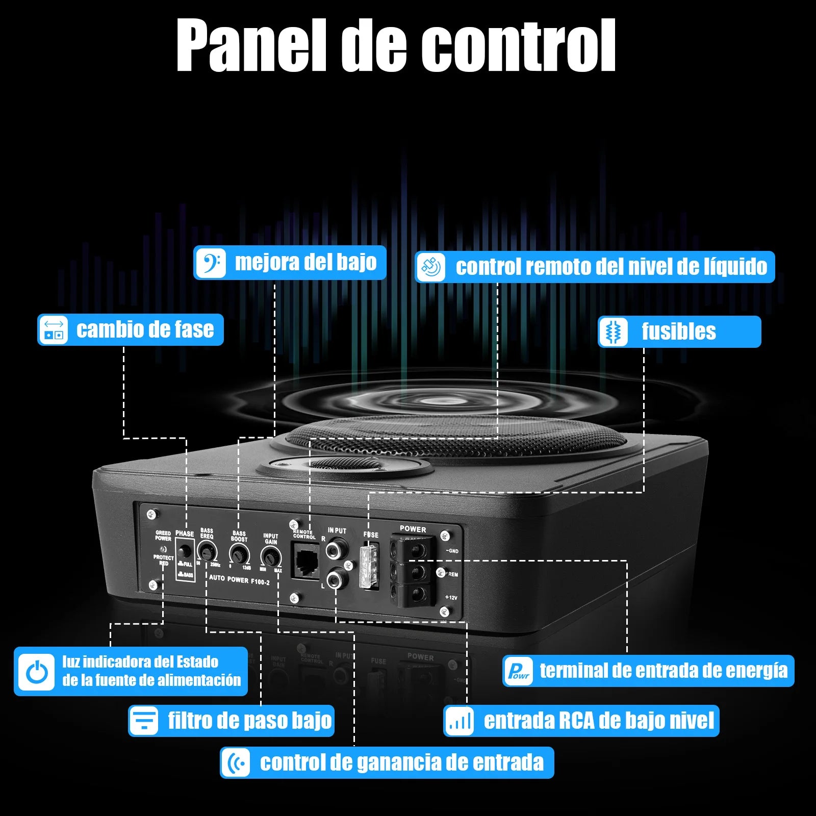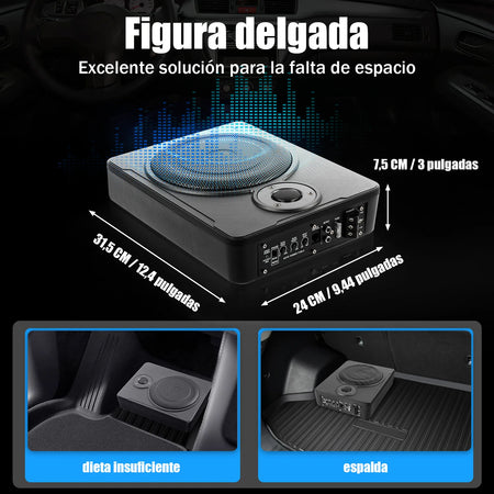 - Plaatsing onder de stoel houdt uw autocabine opgeruimd terwijl het robuuste bas levert.