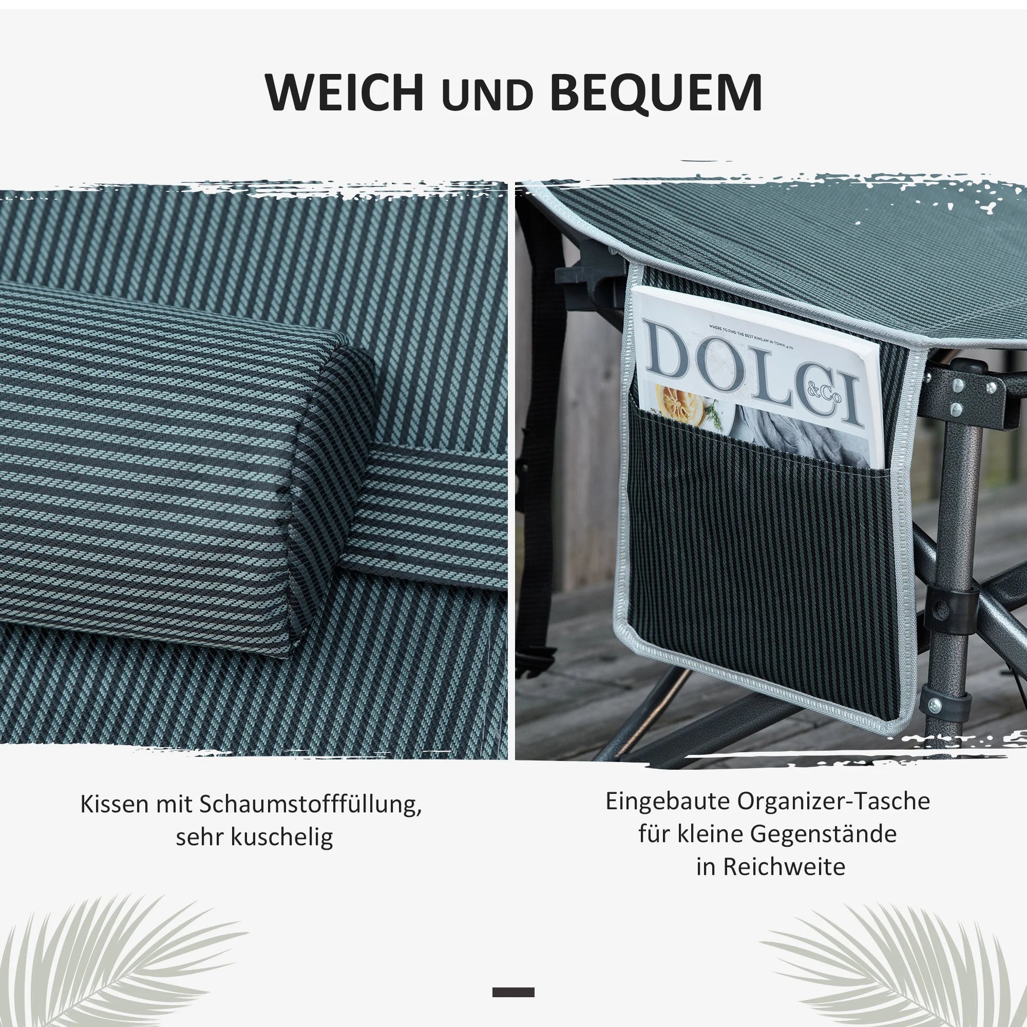 Ontworpen voor comfort het hele jaar door, heeft het een omkeerbare basis: een zachte fluweelachtige kant voor koele herfst- en winterdagen, en een zijdezachte, koele kant voor hete middagen. De basis is gevoerd met pluizig schuim voor een wolkachtig gevoel, terwijl het stevige metalen frame je stabiel en ondersteund houdt. Het meegeleverde kussen voegt extra hoofd- en nekcomfort toe, en een handige opbergtas houdt alles netjes bij elkaar.