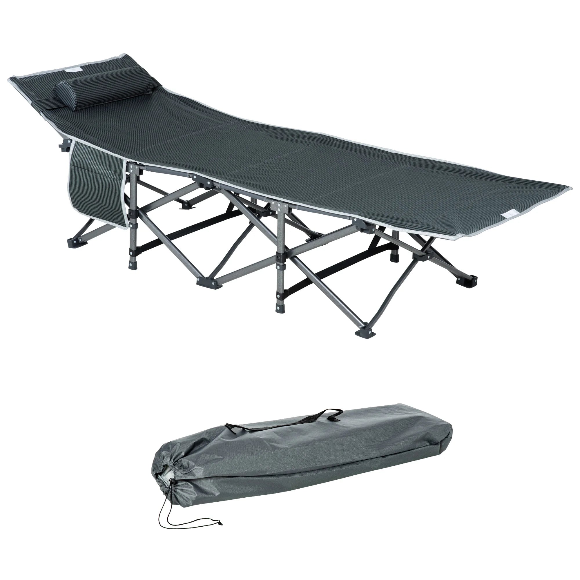 Ontdek ontspanning overal met de Opvouwbare Zonne-ligstoel Met Kussen En Opbergtas in Grijs. Dit compacte, draagbare campingbed is ontworpen voor eenvoudige opzet en moeiteloos transport, waardoor het ideaal is voor kampeertrips, stranddagen, festivals, of als extra logeerbed thuis.