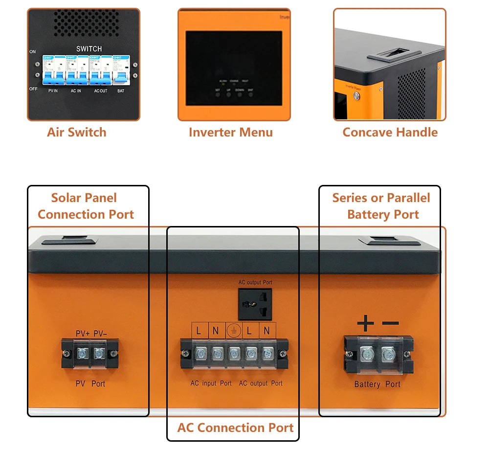 - Maximaliseer het opladen via zonne-energie met de ingebouwde MPPT-lader (tot 5500W invoer) om meer energie van uw PV-array te benutten, zelfs op bewolkte dagen.