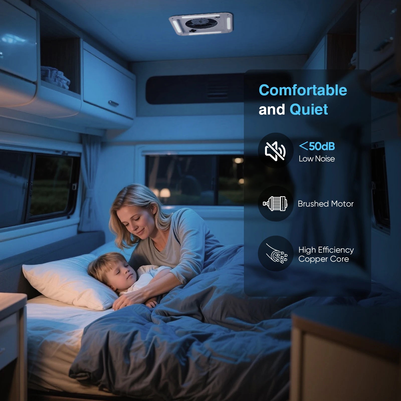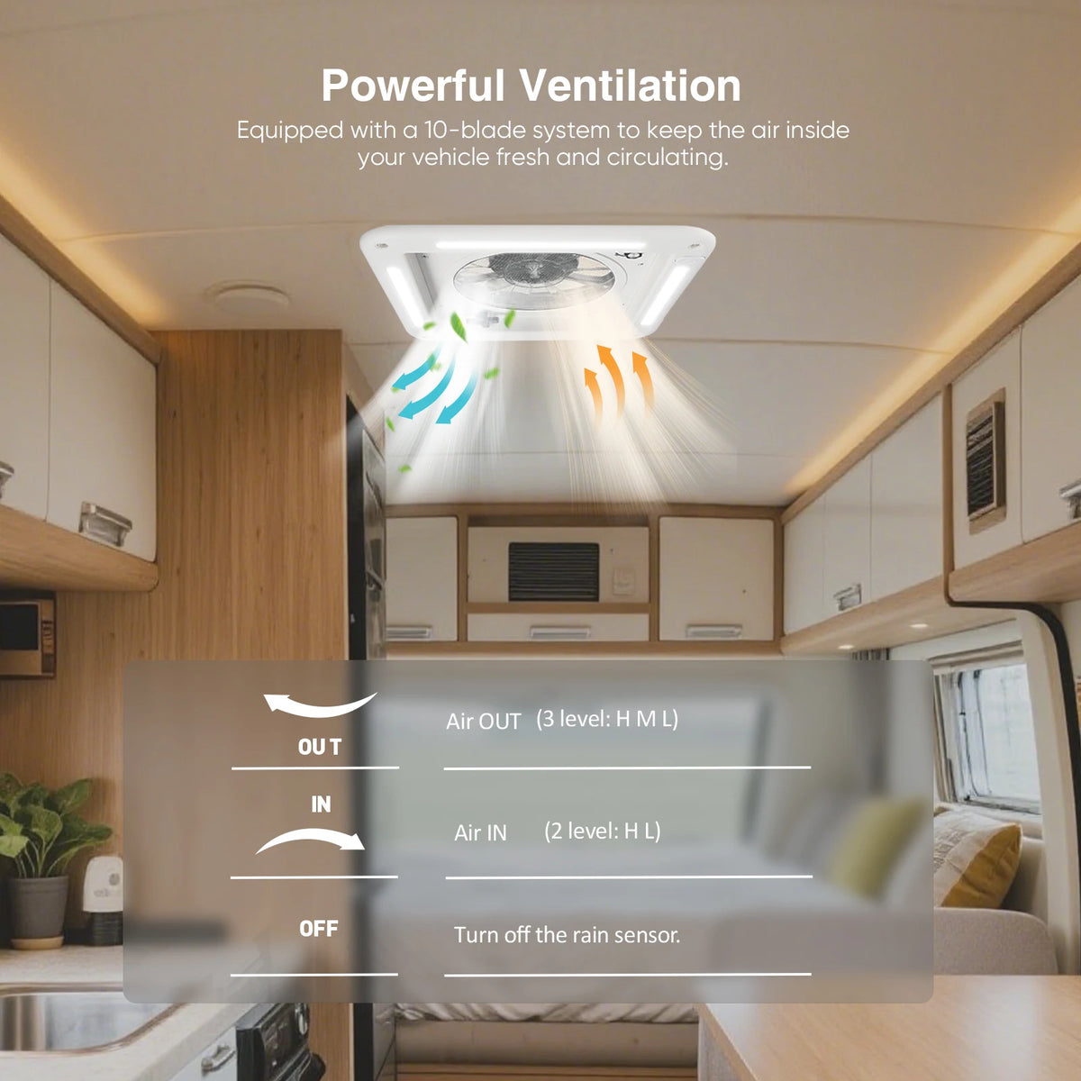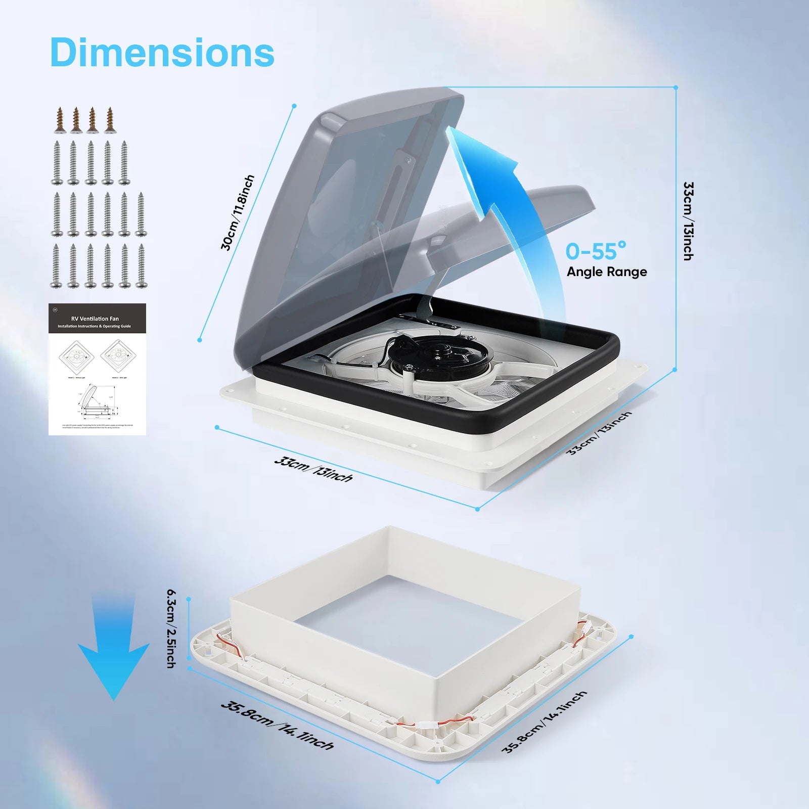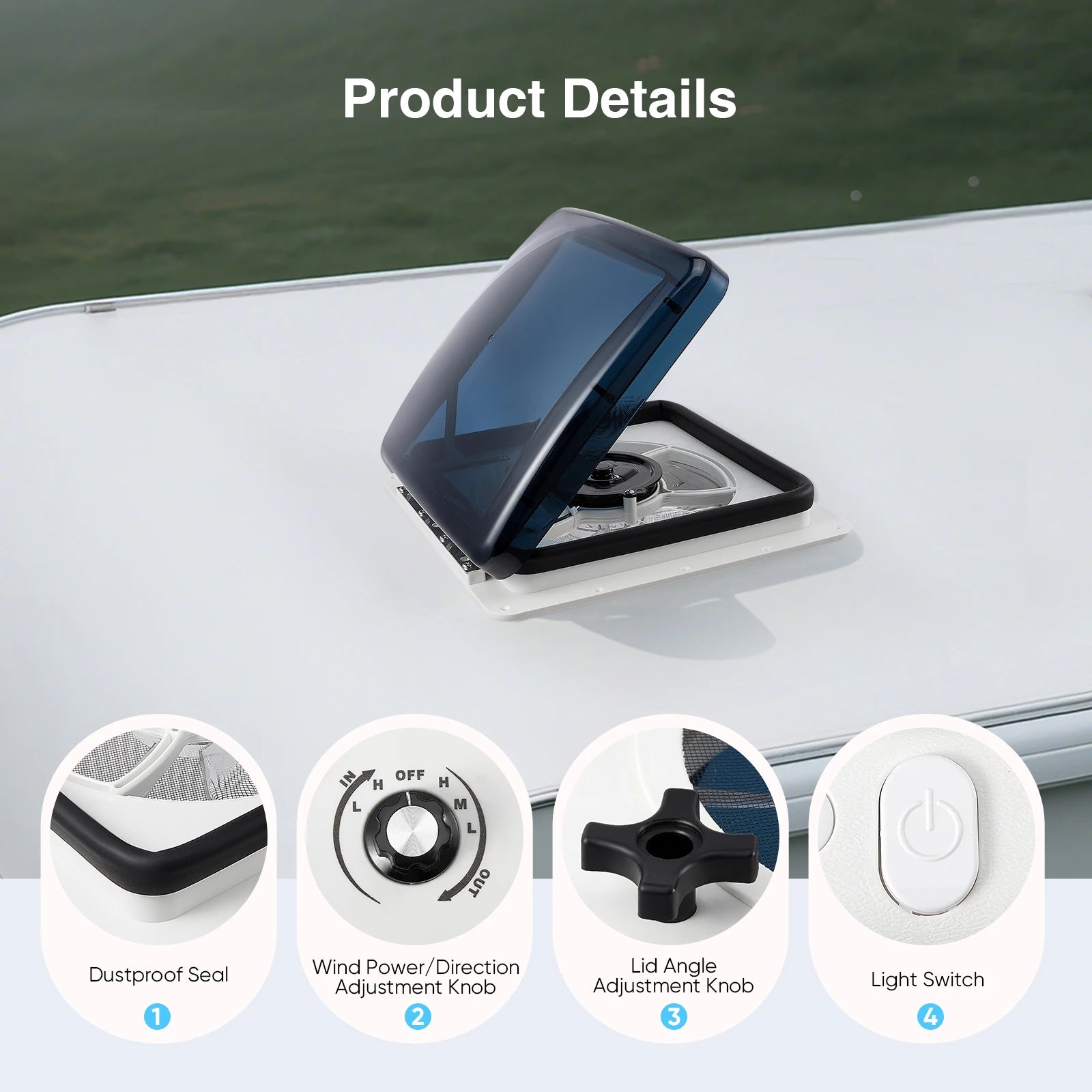 Wszechstronny i łatwy w montażu, ten wentyl dachowy obsługuje tryby wyciągu i dopływu, z 3 prędkościami wyciągu i 2 prędkościami dopływu. Pokrywa może być regulowana od 0 do 55 stopni, aby spełnić codzienne potrzeby wentylacyjne w każdym kamperze, przyczepie lub pojeździe rekreacyjnym. Działa na zasilaniu 12V DC i zawiera standardową kołnierz wentylacyjny 3-calowy dla szybkiego montażu. Zintegrowane światło LED zapewnia widoczność nocą, dzięki czemu możesz wyraźnie widzieć podczas wentylacji lub relaksu wewnątrz.