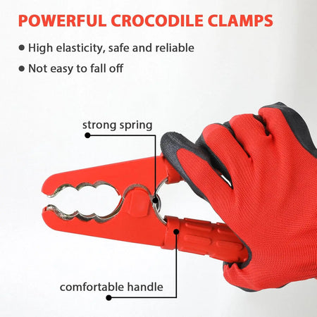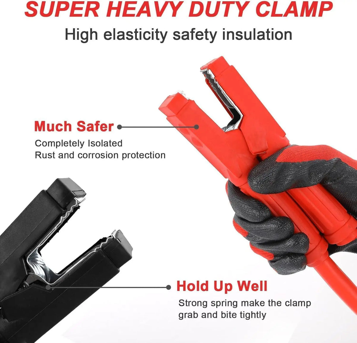 Zapewnione do pracy w trudnych warunkach, miedziany przewodnik oferuje doskonałą przewodność, podczas gdy solidna konstrukcja odporna jest na zużycie i ścieranie. Bardzo duże klipsy krokodylkowe mają mocne sprężyny i powłokę PVC odporną na rdzę, zapewniając pewny chwyt za każdym razem. Izolacja jest ognioodporna i zaprojektowana tak, aby pozostać elastyczna w zimnych warunkach do -40°F (-40°C) oraz niezawodna w gorącym klimacie.