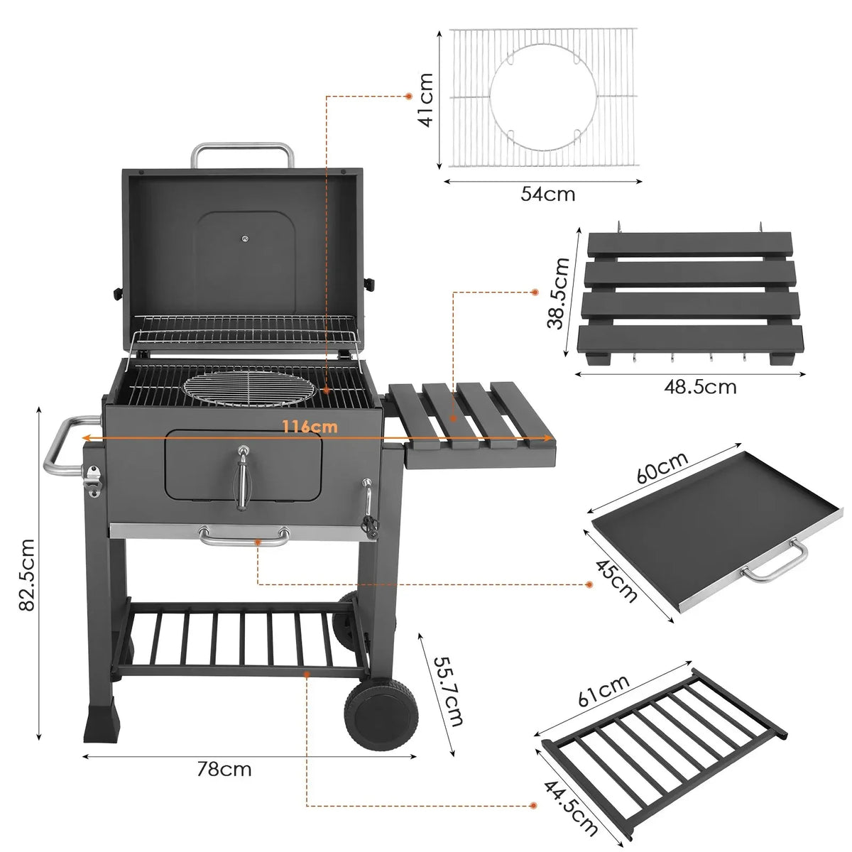 Podnieś poziom gotowania na świeżym powietrzu dzięki Luksusowemu Grillowi Węglowemu na Kółkach dla 5 do 10 osób. Ten XXL grill węglowy stoi na solidnym wózku ze stali malowanej proszkowo, oferując obszerną przestrzeń do gotowania i elastyczną kontrolę ciepła na spotkania – od rodzinnych grillów po przyjęcia w ogrodzie. Wyposażony jest w 3 ruszty, wbudowany termometr, popielnik, półki z haczykami oraz regulowaną wysokość tacki na węgiel z czterema otworami wentylacyjnymi dla precyzyjnego przepływu powietrza. Dzięki dwóm kołom ułatwiającym transport, przednim drzwiom do węgla i wysuwanemu popielnikowi do łatwego czyszczenia, grill ten sprawia, że grillowanie jest bezwysiłkowe. Wszystkie urządzenia elektroniczne i mechaniczne sprzedawane przez InterCyprus do krajów UE posiadają certyfikat CE i dwuletnią gwarancję.
