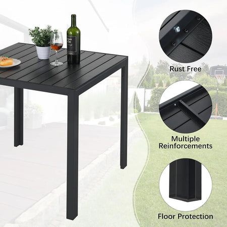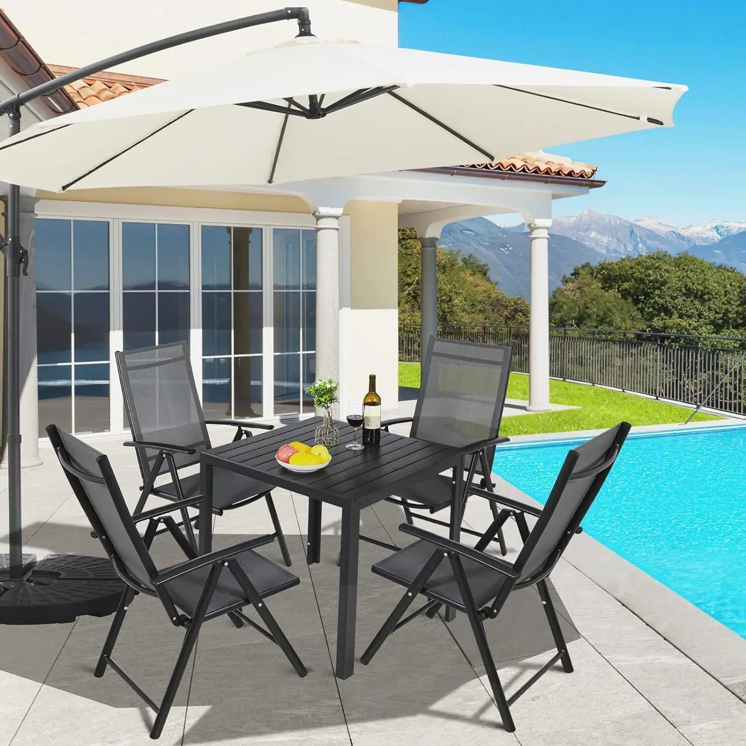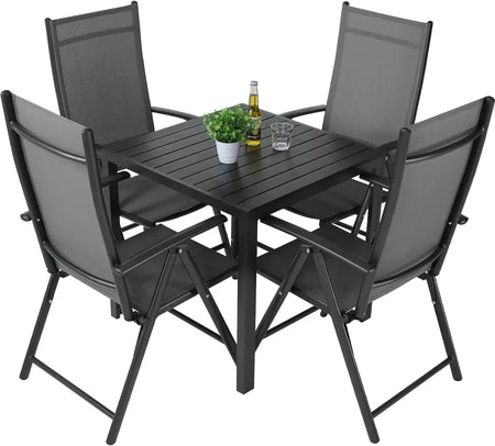 Ulepsz swoje życie na świeżym powietrzu dzięki 5-częściowemu zestawowi balkonowemu — nowoczesnemu aluminiowemu stołowi z czterema składanymi krzesłami zaprojektowanymi do kompaktowych przestrzeni. Wykonany z myślą o trwałości i łatwej pielęgnacji, ten minimalistyczny zestaw mebli ogrodowych dodaje wszechstronną przestrzeń do jedzenia lub relaksu na balkonach, patio lub tarasach. Krzesła składają się do przechowywania, a stół pozostaje stabilny podczas codziennego użytkowania, dzięki czemu możesz z pewnością cieszyć się kawą, posiłkami lub rozmowami na zewnątrz. Montaż jest prosty, a odporna na warunki atmosferyczne aluminiowa konstrukcja wytrzymuje słońce, deszcz i wiatr.