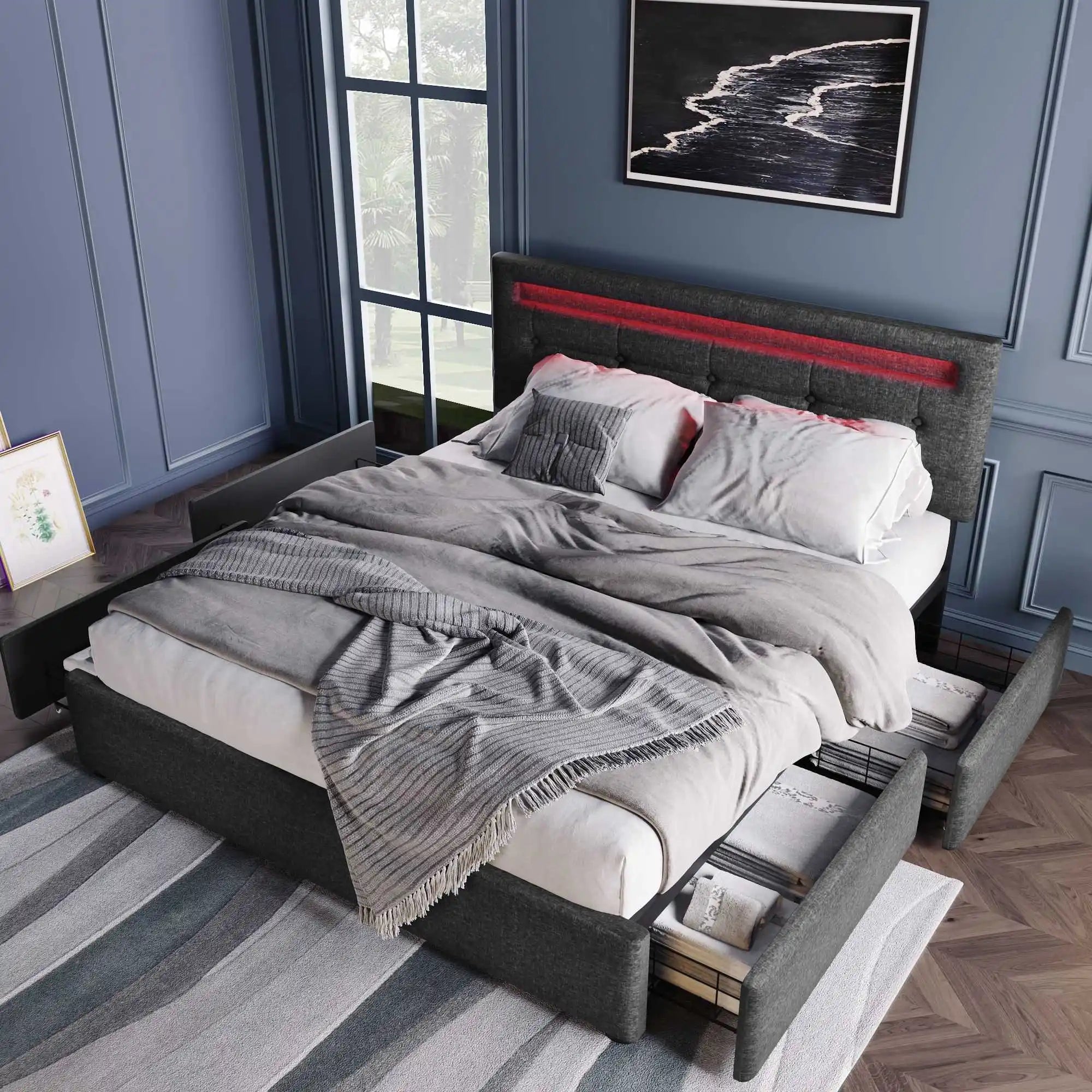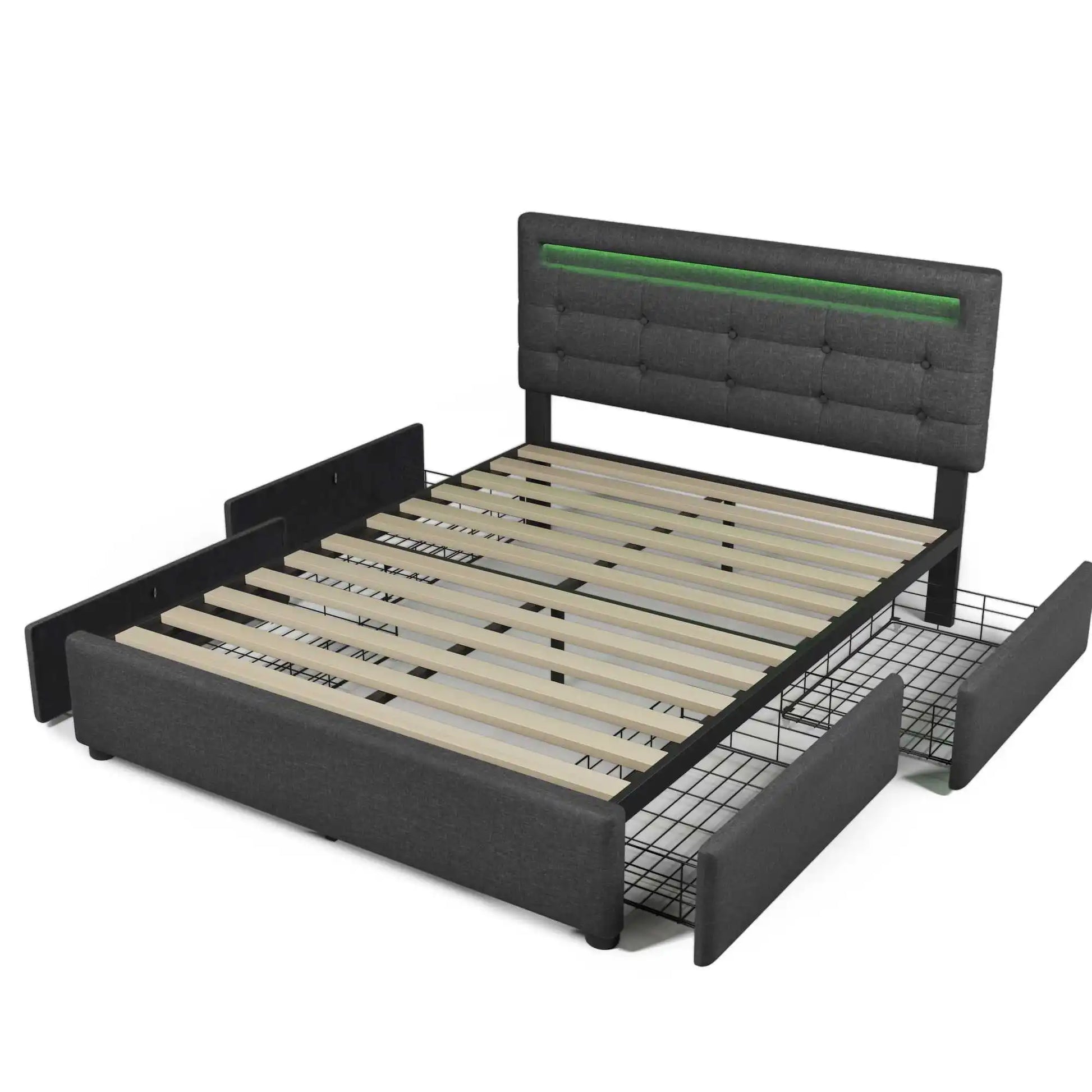 Szara tapicerowana rama łóżka z podświetlanym zagłówkiem i szufladami