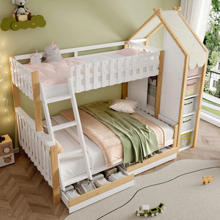 Przestrzeń do przechowywania jest przemyślanie zintegrowana, aby utrzymać porządek w sypialniach. Bok w kształcie domu posiada wiele otwartych schowków oraz wbudowaną ukrytą przestrzeń do przechowywania. Dwie dodatkowe szuflady pod dolnym łóżkiem zapewniają dodatkowe miejsce na ubrania, zabawki lub pościel, pomagając maksymalnie wykorzystać kompaktową przestrzeń. Bezpieczeństwo jest priorytetem dzięki solidnym barierkom wokół górnego łóżka, zaprojektowanym dla dzieci od sześciu lat wzwyż.