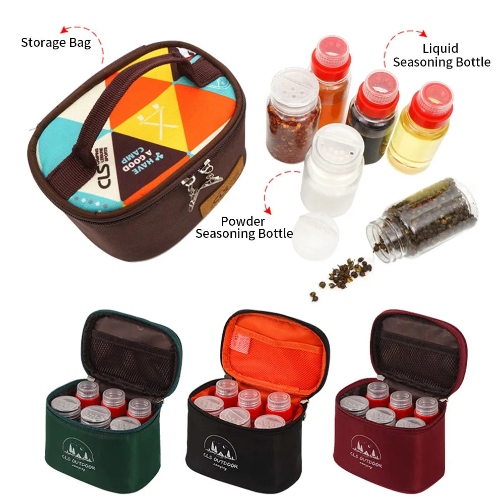Zestaw pojemników na przyprawy do kampingu – zawiera torbę do przechowywania — Kompaktowy, odporny na wycieki zestaw przypraw i przypraw zaprojektowany do gotowania na świeżym powietrzu i podróży. Zawiera 3 butelki oleju/sosu, 3 słoiki z przyprawami i trwałą torbę do przenoszenia, aby zorganizować przygotowanie posiłków bez bałaganu w drodze.