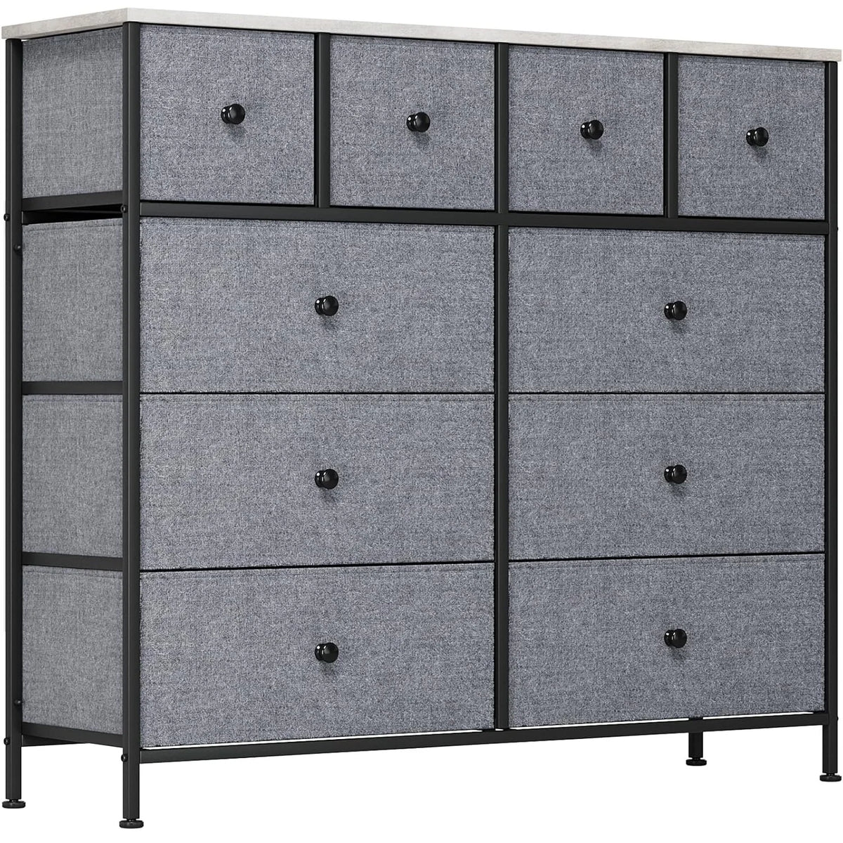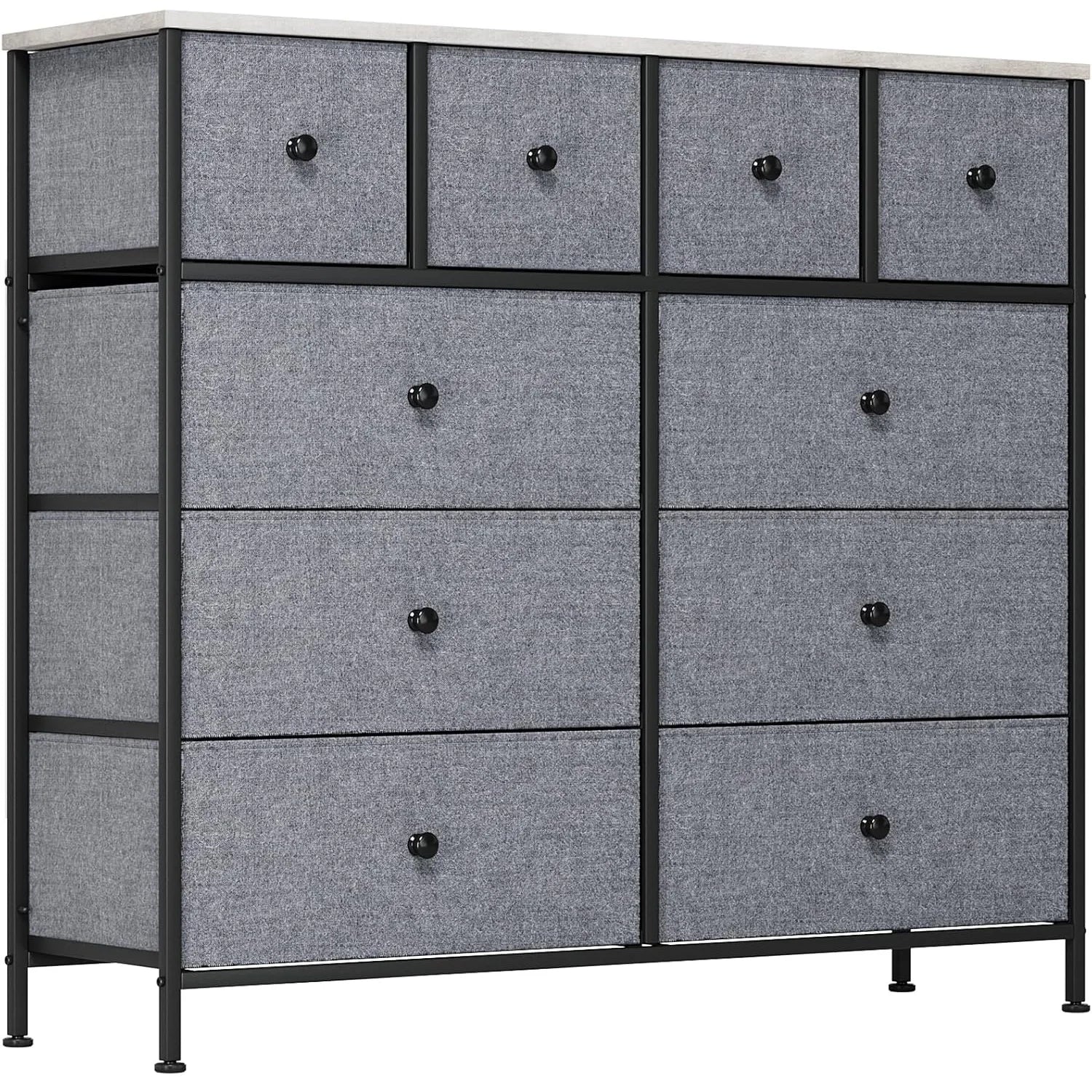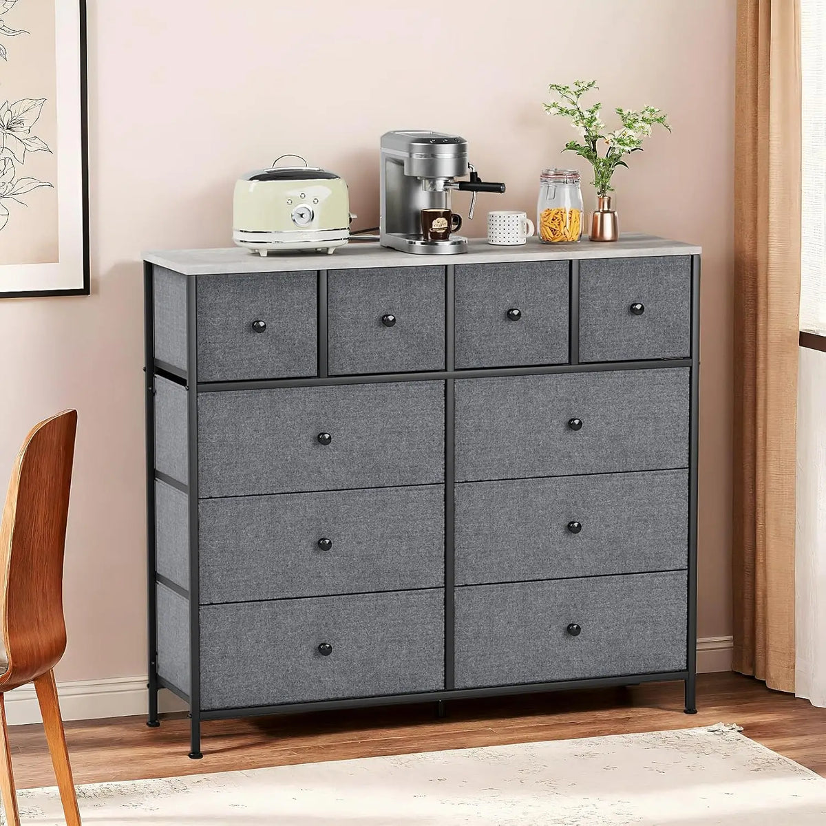 10-szufladowa tkaninowa skrzynia z drewnianym blatem, metalowa rama, antyprzechyłowa