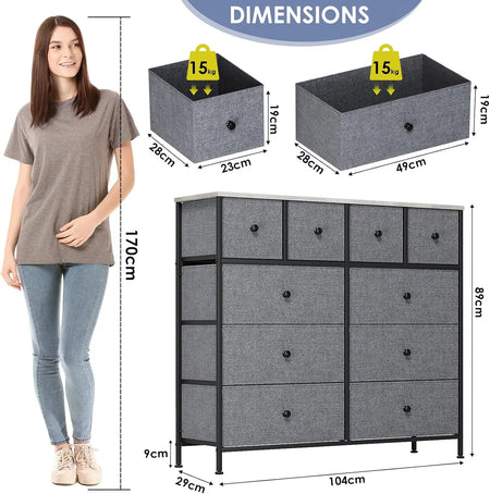 - Inteligentna organizacja: 10 szuflad — małe szuflady na biżuterię, okulary i gadżety; większe szuflady na ubrania, koce lub zabawki.