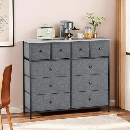 Odkryj 10-szufladową skrzynię z tkaniny z drewnianym blatem i metalową ramą zapobiegającą przewróceniu od HOMFA — eleganckie rozwiązanie do przechowywania łączące vintage'owy urok z solidną, nowoczesną konstrukcją. Ta wszechstronna skrzynia posiada trwałą stalową ramę, ciepły drewniany blat oraz oddychające szuflady z tkaniny nietkanej, które utrzymują ubrania, zabawki i codzienne niezbędniki w porządku. Urządzenia zapobiegające przewróceniu oraz regulowane, antypoślizgowe nóżki zapewniają stabilność w ruchliwych domach, a wolnostojący design doskonale pasuje do sypialni, salonów, korytarzy czy przestrzeni dziecięcych. Dzięki 10 szufladom z tkaniny zyskujesz uporządkowany podział na małe przedmioty i większe ubrania. Gładki drewniany blat stanowi praktyczną powierzchnię do ekspozycji lub codziennych przedmiotów i jest łatwy do czyszczenia.