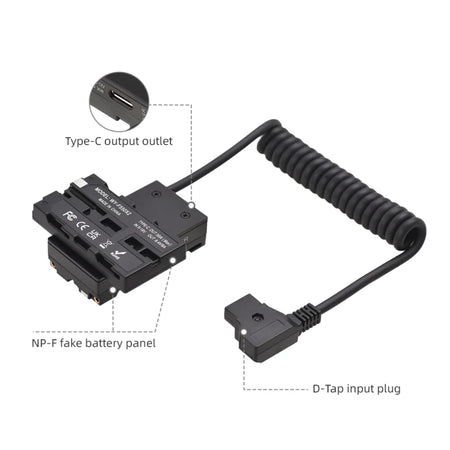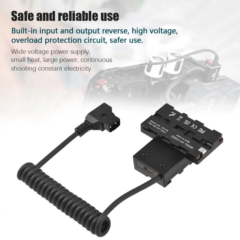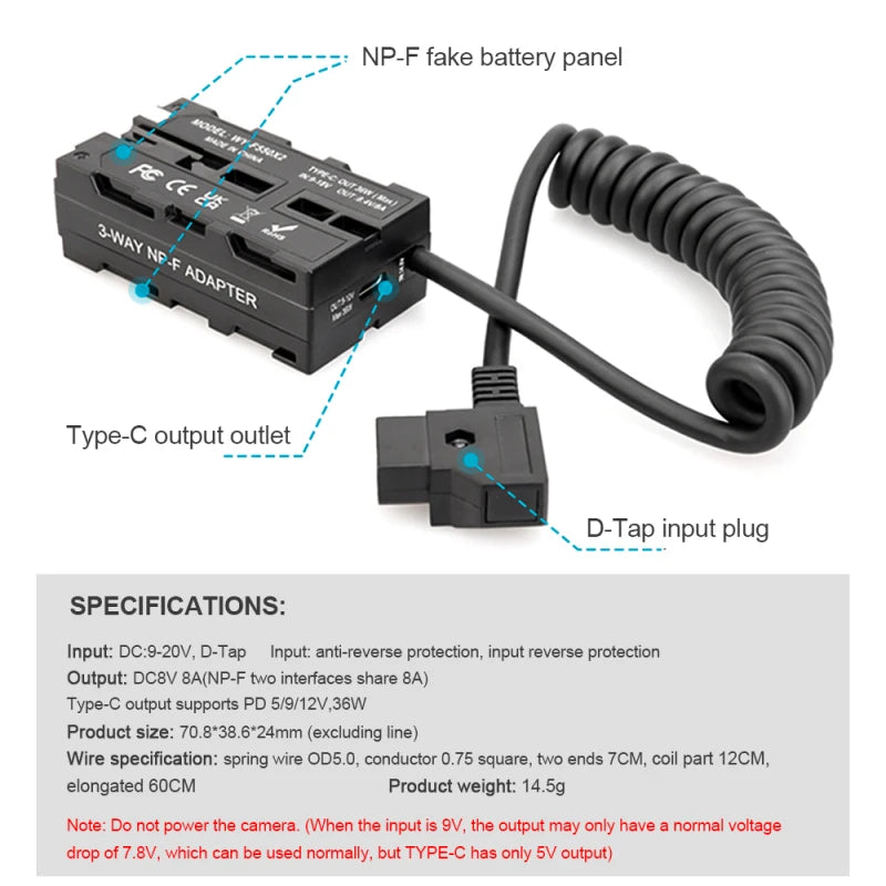 - Używaj tylko z kompatybilnymi bateriami NP-F i urządzeniami D-Tap. Nie przekraczaj zalecanych specyfikacji wyjściowych.