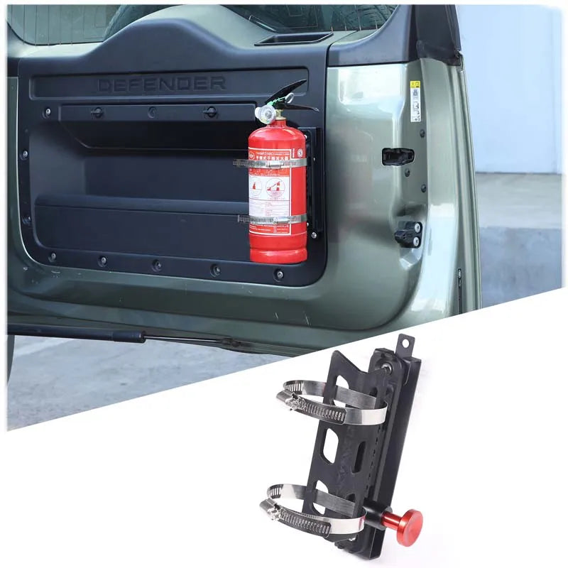 - 1 x Uchwyt na gaśnicę do tylnej klapy Defender 90 110 (czarny, plastik ABS i stop aluminium)