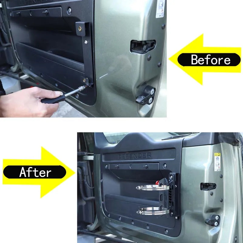 Wykonany z wysokiej jakości plastiku ABS i stopu aluminium, ten uchwyt jest odporny na zarysowania i zużycie, zaprojektowany do wytrzymania trudnych warunków. Montuje się go za pomocą prostej taśmy klejącej z tyłu, więc nie wymaga wiercenia ani trwałych zmian w Defenderze. Eleganckie czarne wykończenie idealnie komponuje się ze stylem pojazdu, tworząc funkcjonalną aktualizację, która wygląda jak fabryczna.