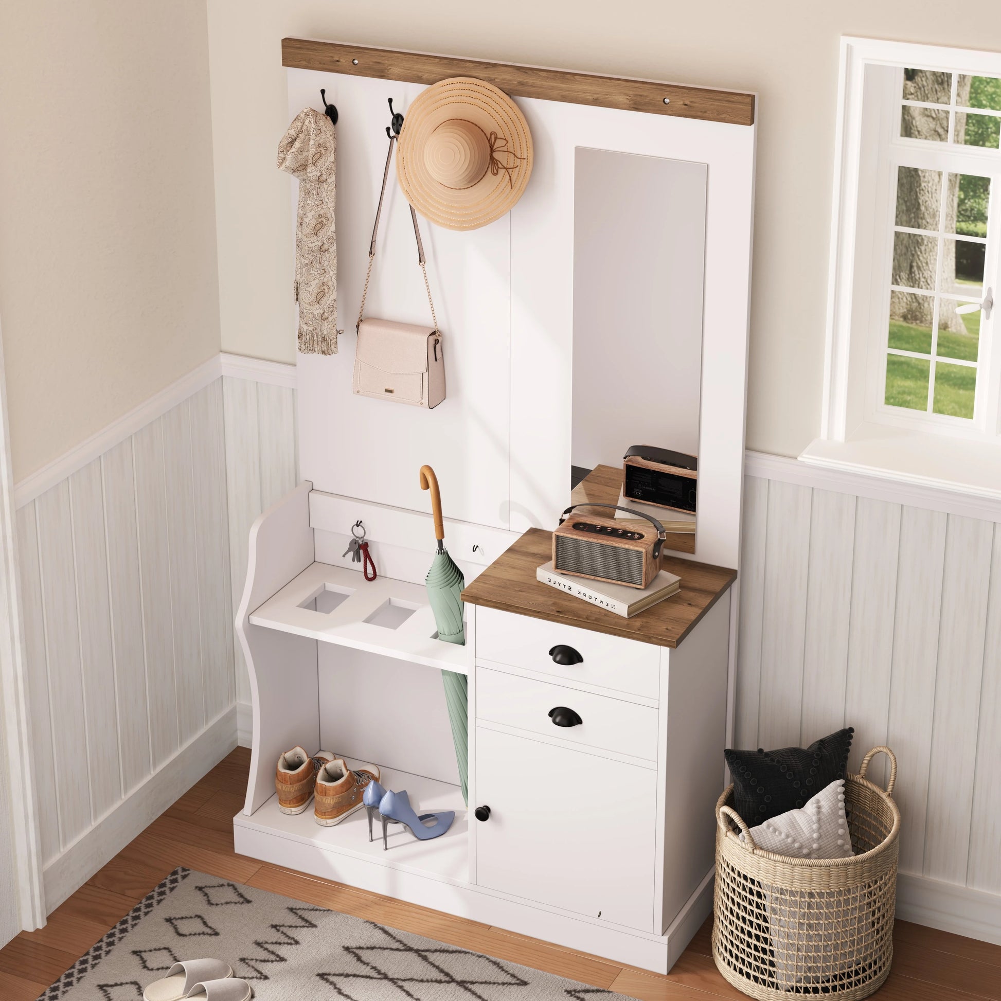 - Zintegrowane funkcje: Wbudowane lustro, dwie szuflady, jedno drzwi, haczyk po lewej stronie, dolny stojak na parasole i buty, dwa małe haczyki na klucze