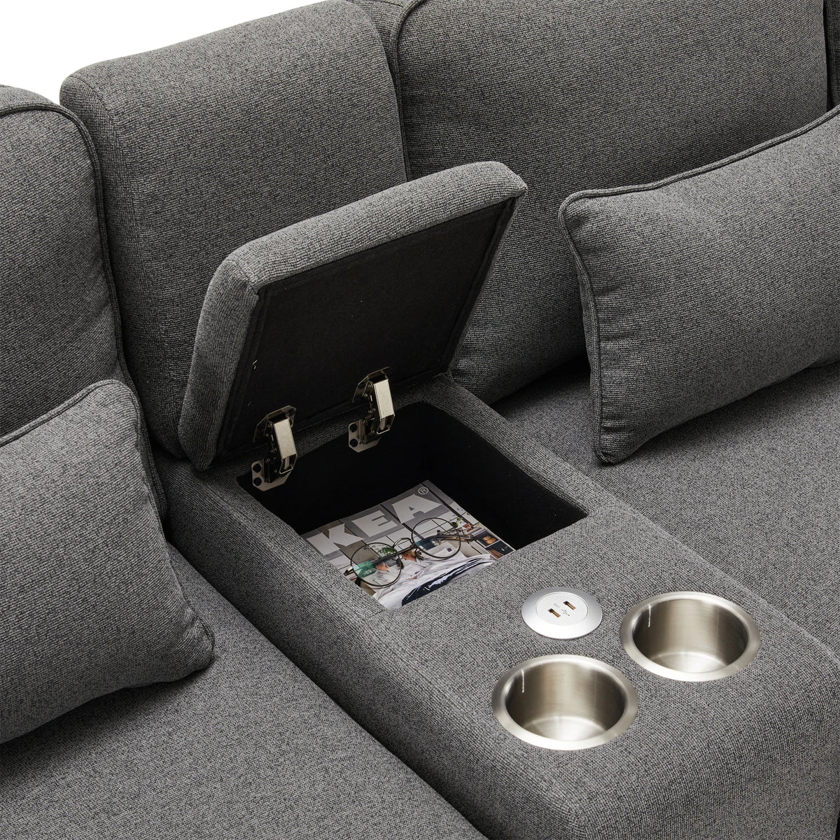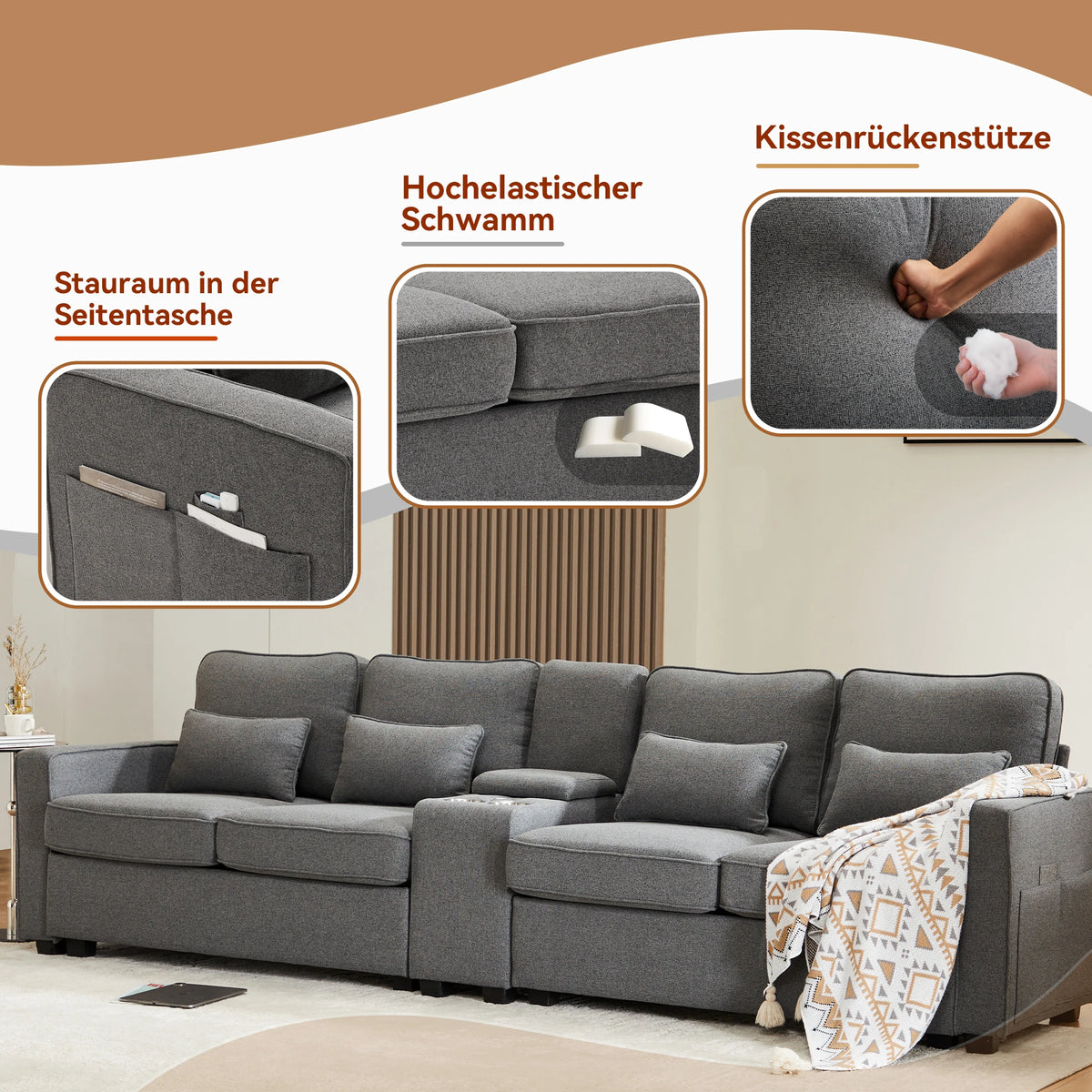 Nowoczesna 4-osobowa sofa lniana z konsolą i portami USB