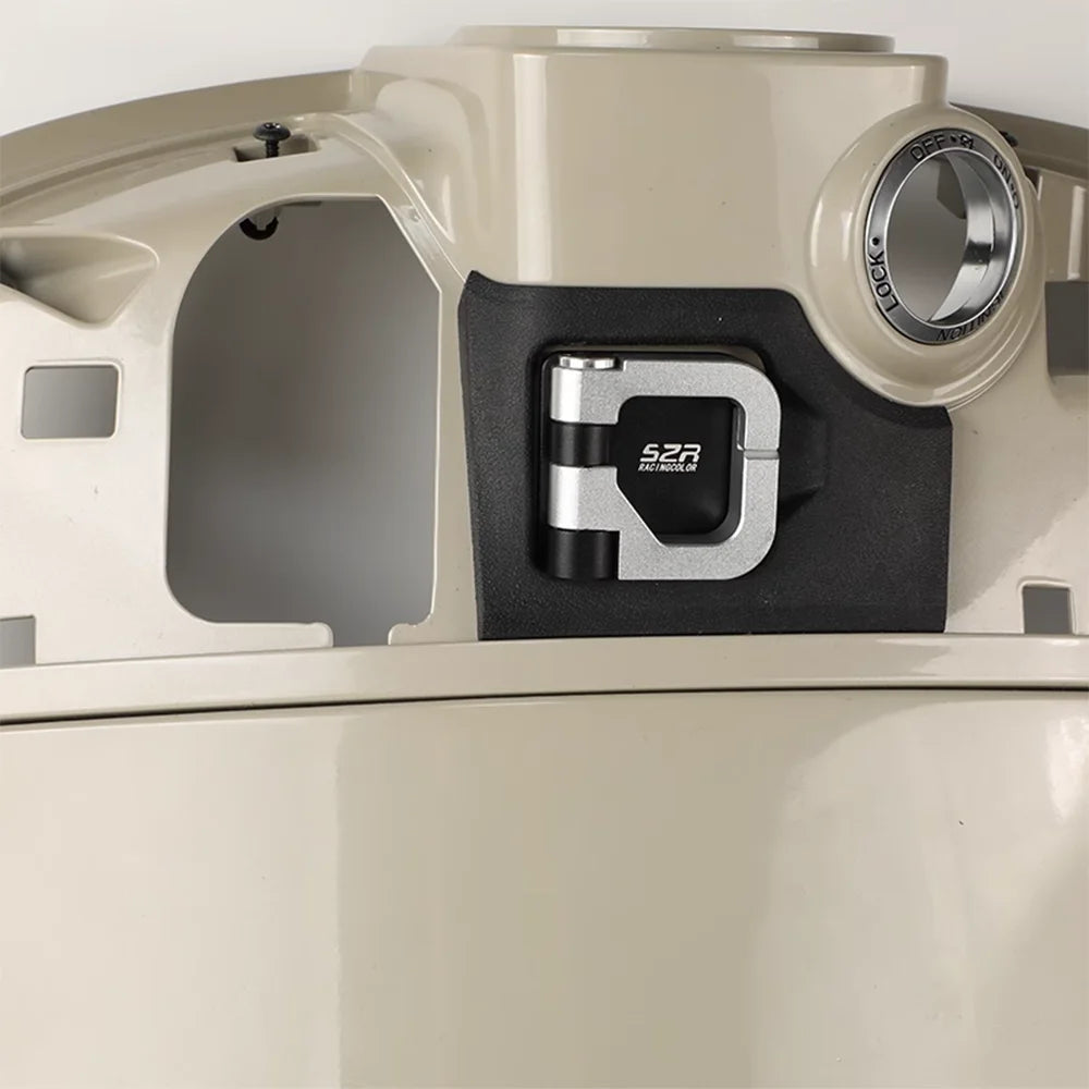 Vespa GTS 300 GTV 300 2023-2024 Aluminiowy Składany Hak na Bagaż to inteligentna aktualizacja Twojej Vespy, łącząca wytrzymałą konstrukcję z aluminium z praktycznym składanym zapięciem. Zaprojektowany dla Vespa GTS 300/Super 2023–2024 oraz GTV 300 2023–2024, ten hak utrzymuje Twój bagaż lub kask bezpiecznie podczas jazdy, nawet po nierównych drogach. Jego anodowana powłoka odporna jest na blaknięcie i rdzę, zachowując elegancki, premium wygląd na Twoim motocyklu.