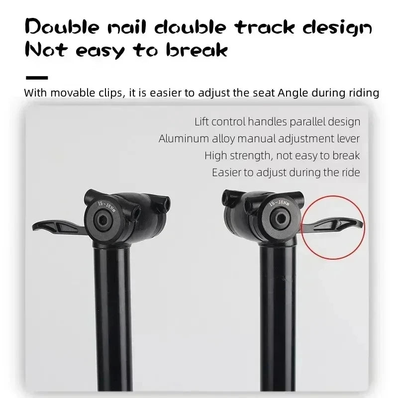 Rurka podsiodłowa z podnoszeniem powietrznym może być zablokowana w dowolnej pozycji bez zakłócania ramy, dając wszechstronną regulację w locie. Wodoodporna i pyłoszczelna uszczelka chroni sztycę w błotnistych lub zakurzonych warunkach. Aluminiowy, ręczny pręt regulacyjny pozwala na szybkie zmiany wysokości siodełka, podczas gdy podwójny gwóźdź i podwójny tor zapewniają płynną i trwałą regulację kąta. Amortyzacja miękka/twarda pozwala dostosować komfort jazdy do nawierzchni i wagi rowerzysty. Precyzja CNC i laserowo wygrawerowane logo RIRO łączą się, zapewniając niezawodną wydajność i premium wygląd.