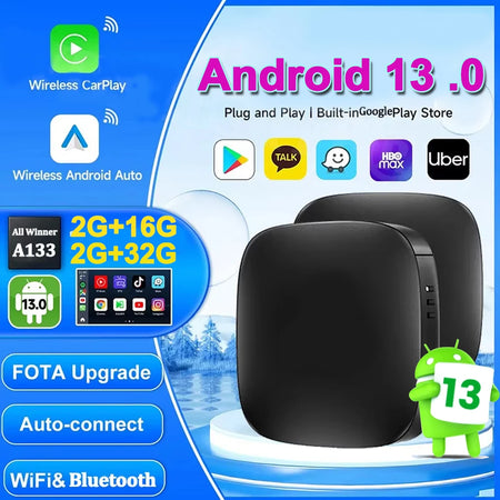 Bezprzewodowy Android Auto CarPlay Car TV Box z Androidem 13 GMS to najlepsza aktualizacja rozrywki w samochodzie. Dzięki pełnemu systemowi Android i Google Mobile Services możesz uzyskać dostęp do Google Play Store, pobierać ulubione aplikacje i cieszyć się płynną nawigacją, strumieniowaniem i produktywnością na wyświetlaczu swojego samochodu. To urządzenie łączy przewodowy CarPlay z bezprzewodowym CarPlay oraz przewodowy CarPlay z bezprzewodowym Android Auto, zapewniając nowoczesne, uporządkowane doświadczenie na desce rozdzielczej.