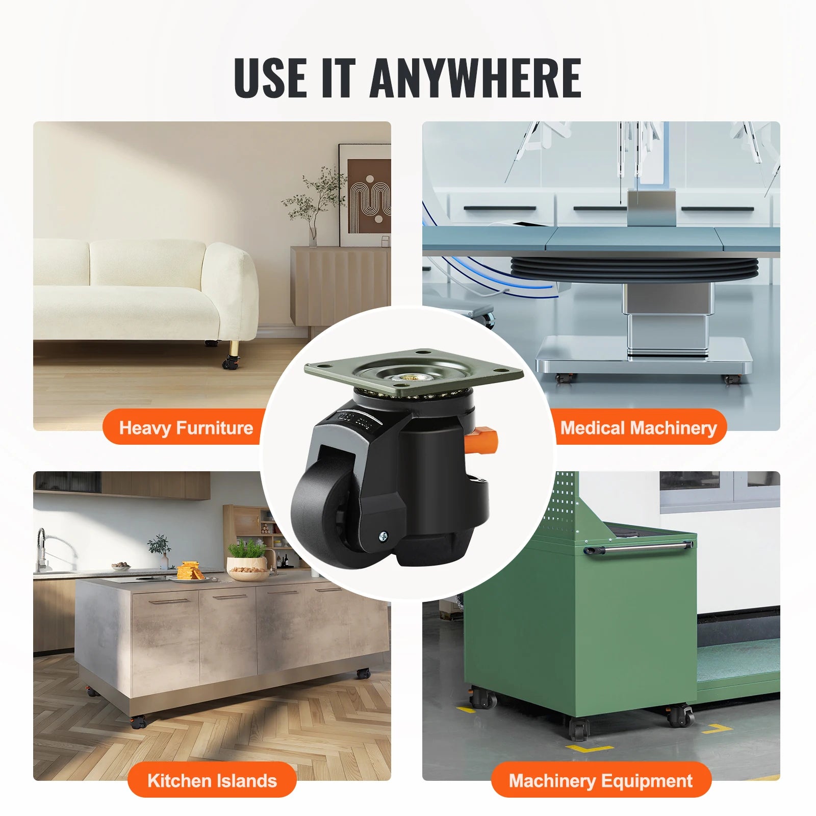 Każde kółko wyposażone jest w uchwyt poziomujący do precyzyjnej regulacji wysokości, zapewniając stabilną podstawę na nierównych podłogach. Konstrukcja z obrotem 360° umożliwia łatwy ruch, a gumowa podkładka tłumi drgania, chroniąc wrażliwy sprzęt i redukując hałas. Wykonane z wysokowytrzymałej górnej płyty ze stali węglowej i aluminiowego wspornika, te kółka są gotowe do przenoszenia ciężkich ładunków — do 2200 funtów siły podnoszenia.