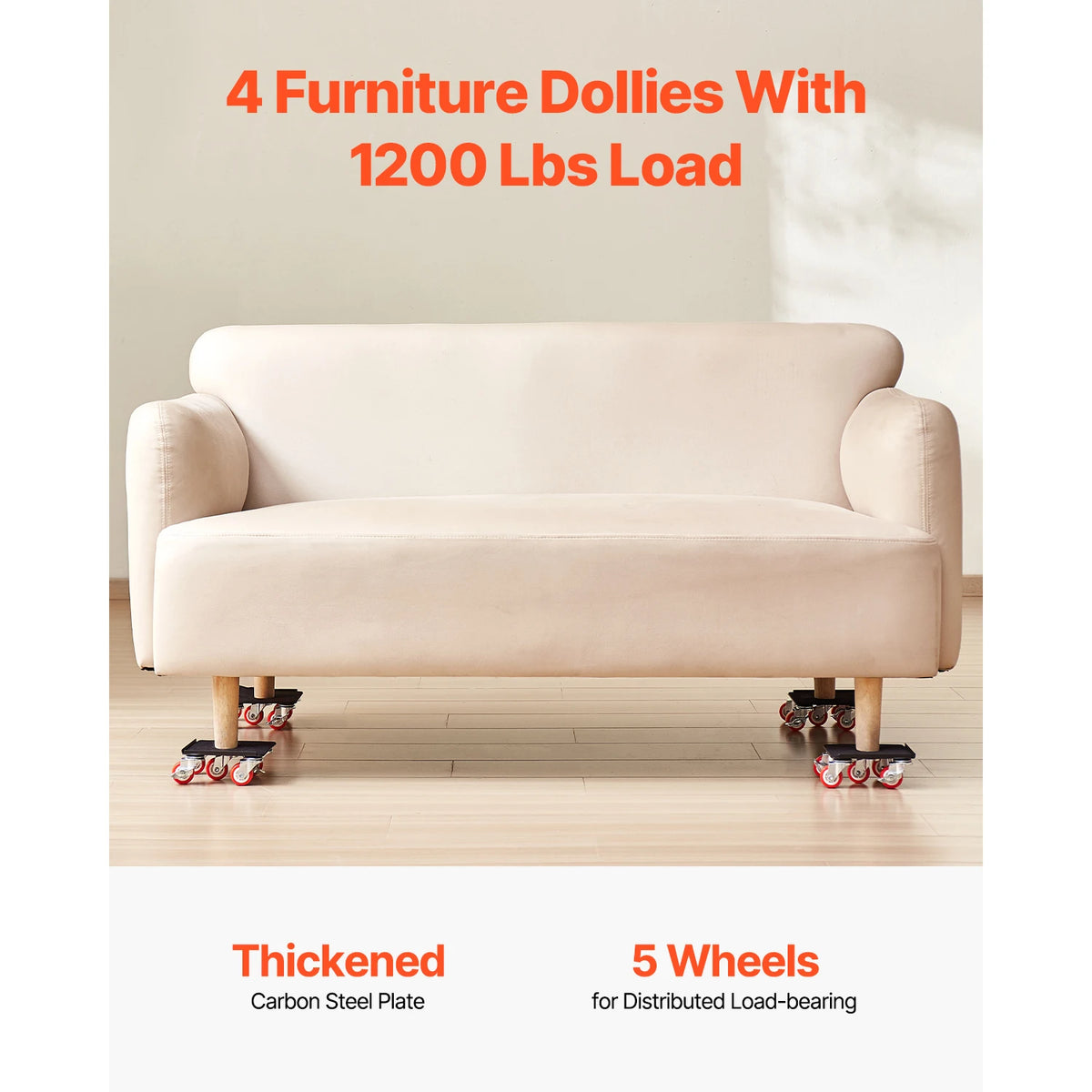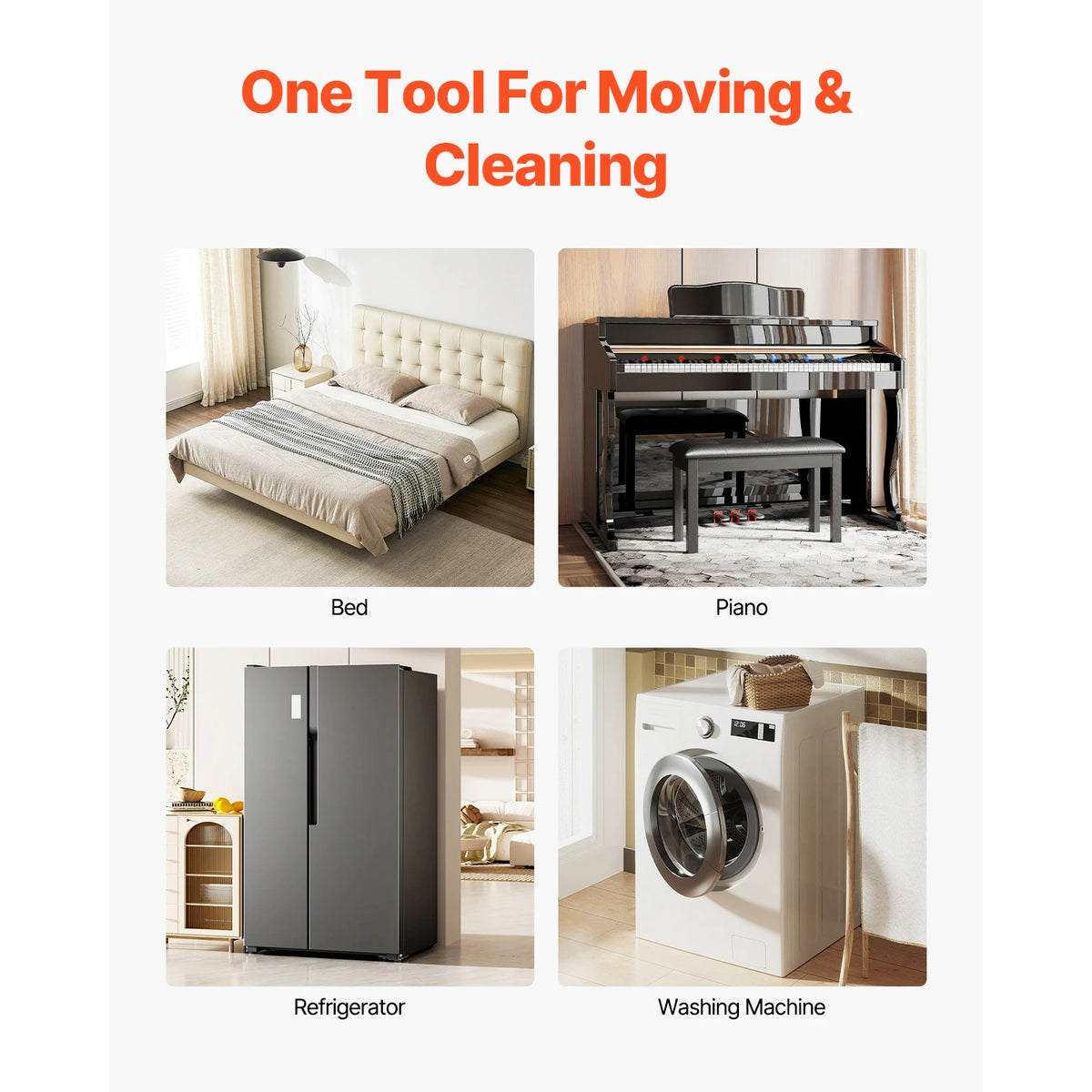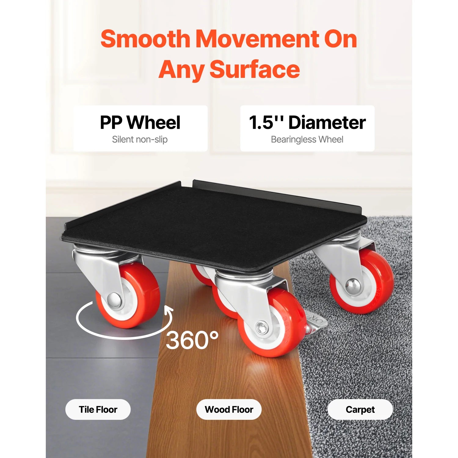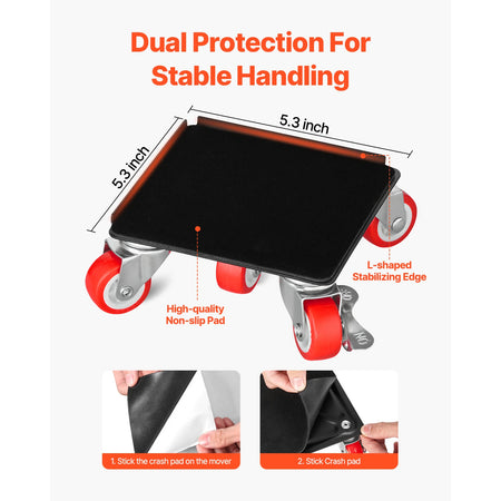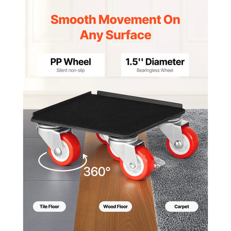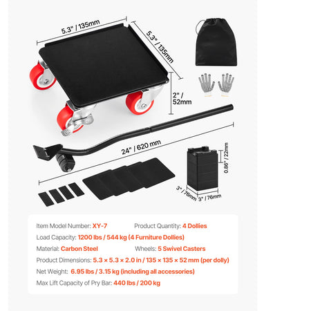 Przemieszczaj ciężkie meble i urządzenia z pewnością dzięki Czterem wózkom z kołami obrotowymi 360 stopni do przenoszenia lodówek. Ten wytrzymały zestaw jest zaprojektowany do domowych prac DIY i codziennych przeprowadzek, zapewniając stabilność, łatwość i ochronę podłóg. Każdy wózek wyposażony jest w pięć kół obrotowych dla łatwej nawigacji 360°, a niski środek ciężkości oraz wzmocniona stalowa rama minimalizują chwianie się na schodach, progach i w wąskich korytarzach. Z całkowitą nośnością 3474 lbs dla zestawu czterech wózków (1200 lbs na wózek) możesz transportować lodówki, sofy, komody i inne masywne przedmioty bez obciążania pleców. Dołączony łom o długości 24 in (620 mm) ułatwia podnoszenie i pozycjonowanie, a hamulec na jedno kliknięcie pozwala szybko zabezpieczyć ładunki w dowolnym miejscu zatrzymania. Powierzchnie antypoślizgowe i ochronne wyściółki pomagają chronić podłogi i meble przed zarysowaniami, czyniąc nawet ambitne przeprowadzki bezpieczniejszymi i prostszymi.
