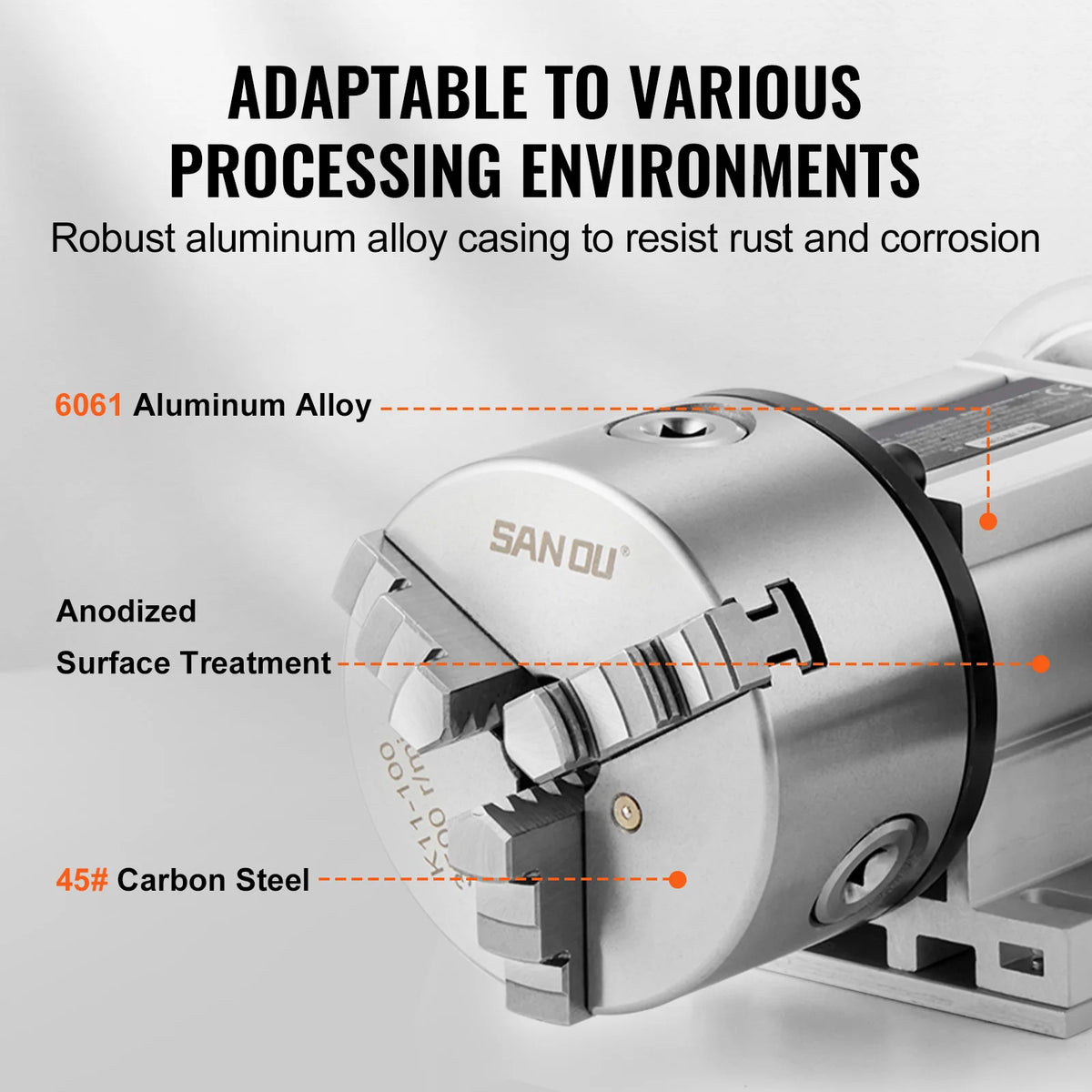 Głowica dzieląca SucceBuy K11 100mm z 3-szczękowym uchwytem i suportem MT2 to solidna oś CNC 4. osi zaprojektowana, aby rozszerzyć możliwości frezowania z niespotykaną precyzją. Zaprojektowana do dokładnego indeksowania, posiada przełożenie 6:1 oraz mocny silnik krokowy Nema23 2-fazowy, zapewniający płynną, powtarzalną pracę w szerokim zakresie kątów. Uchwyt K11-100mm z 3 szczękami oferuje wszechstronne i pewne mocowanie skomplikowanych części, a suport MT2 zapewnia solidne podparcie i precyzyjne ustawienie dla długich lub delikatnych elementów.