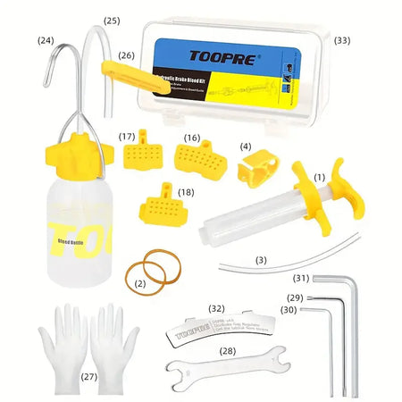 Poznaj zestaw do odpowietrzania hamulców rowerowych TOOPRE, niezawodne narzędzie do odpowietrzania oleju stworzone, by uprościć konserwację hydraulicznych hamulców w nowoczesnych rowerach. Zaprojektowany do współpracy z popularnymi systemami Shimano, Magura, Tektro i SRAM, ten zestaw pomaga wypłukać stary płyn, usunąć pęcherzyki powietrza i przywrócić pewne, skuteczne hamowanie. Lekki i kompaktowy, idealny zarówno do szybkich napraw na trasie, jak i rutynowej obsługi w domu. Dzięki praktycznemu designowi TOOPRE możesz utrzymać stałą skuteczność hamowania, zmniejszyć miękkość hamulców i wydłużyć żywotność ich komponentów, zapewniając czysty, świeży przepływ płynu za każdym razem, gdy jeździsz.