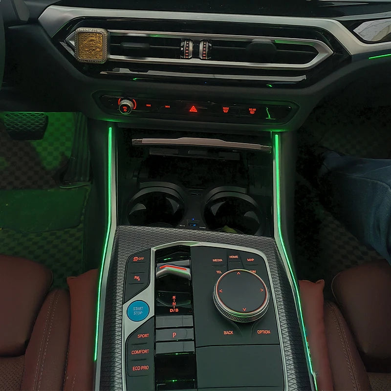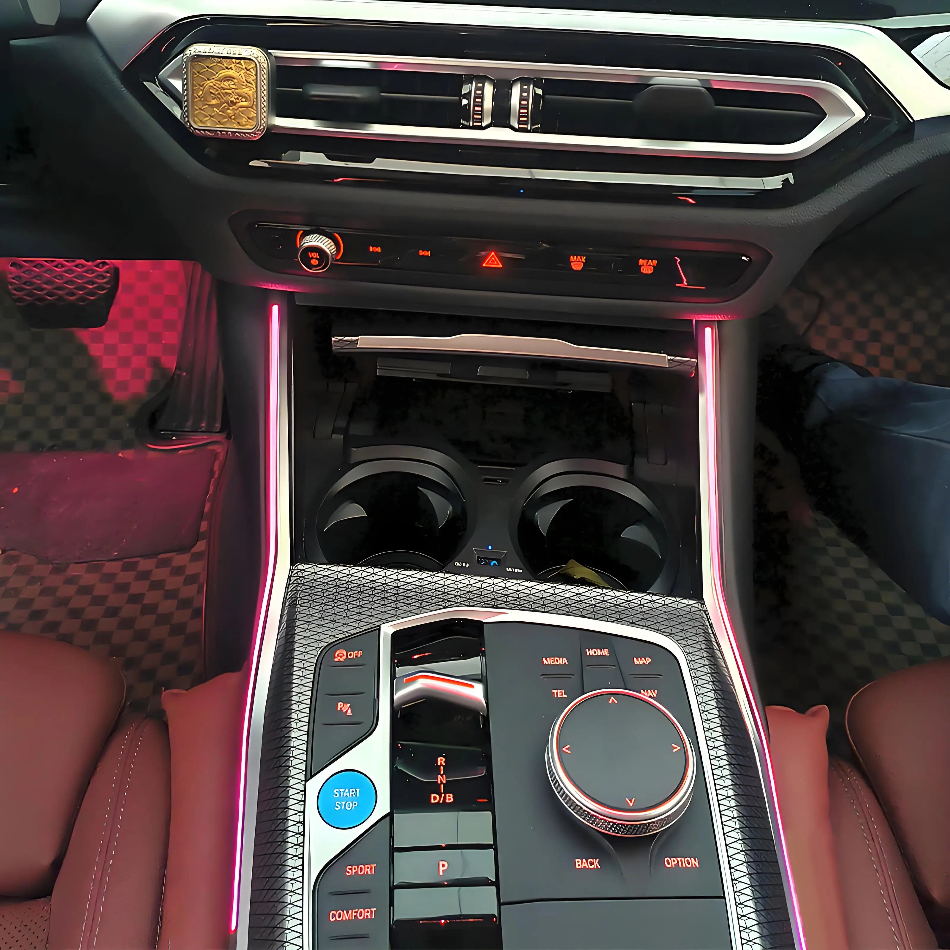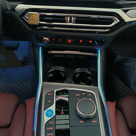 Ulepsz wnętrze swojego BMW dzięki Oświetleniu Ambient w Centralnej Konsoli BMW Serii 3/4 z OEM Ambient Sync ABS Trim. Ten specjalnie zaprojektowany zestaw oświetlenia ambient jest gotowy do podłączenia i zastępuje płytkę wykończeniową centralnego sterowania, aby dostarczyć jednolity blask, który odzwierciedla własne oświetlenie ambient w Twoim samochodzie. Wykonany z trwałego ABS w wyrafinowanym wykończeniu czarnym/włóknie węglowym, zachowuje premium wygląd kokpitu, dodając jednocześnie wyrafinowaną, dopasowaną kolorystycznie atmosferę na nocne przejażdżki. Jest zaprojektowany dla BMW z kierownicą po lewej stronie i pasuje do modeli, w tym Serii 3 G20/G21 (2020–2024), Serii 4 G22/G23 (2021–2024), M3 G80/G81 (2021–2024) oraz M4 G82/G83 (2021–2024). Synchronized color and brightness ensure a cohesive interior theme without extra setup or wiring.