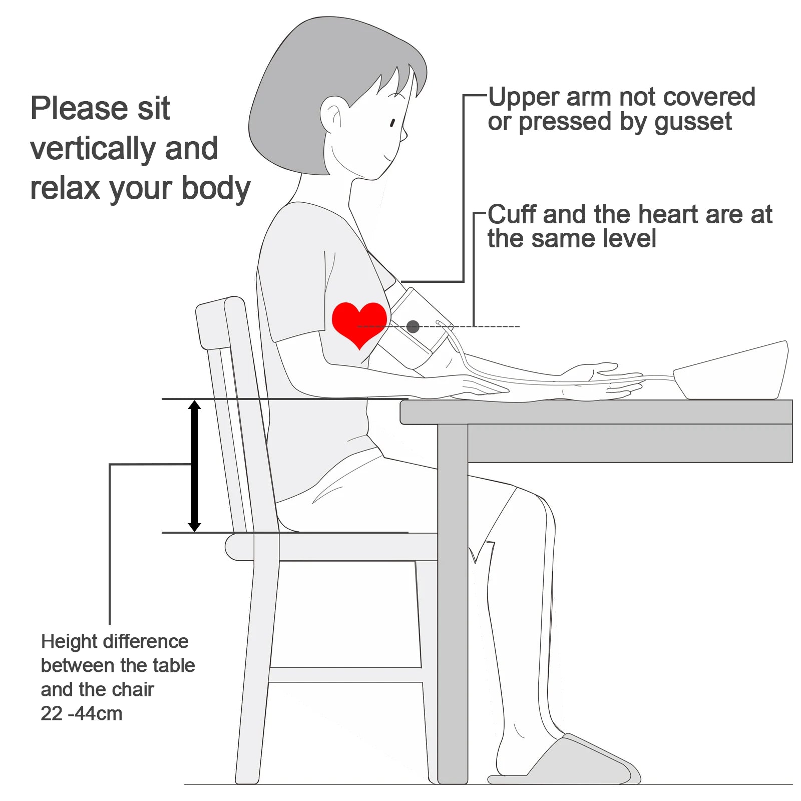 - Usiądź prosto na krześle, stopy płasko na podłodze i zrelaksuj się przed rozpoczęciem. Umieść mankiet na lewym ramieniu powyżej łokcia, z krawędzią mankietu około 2–3 cm powyżej stawu łokciowego.