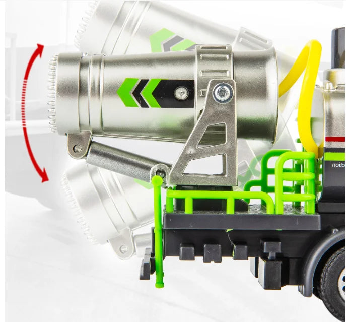Introducing the CONUSEA Simulatio Alloy Diecast Anti Smog Truck with Sound Lights, a compact 1:50 scale green toy designed for imaginative play. Built with an ABS plastic chassis and rubber tires, this durable model measures about 21.5 cm long, 8 cm wide, and 5.5 cm tall. It features a manually fillable water reservoir, a water barrel that can be rotated 180°, a front-top switch to activate lights and sounds, and a convenient pull-back action for quick starts. This interactive truck is ideal for kids aged 6 and up, as well as collectors who love distinctive toy vehicles with engaging features.