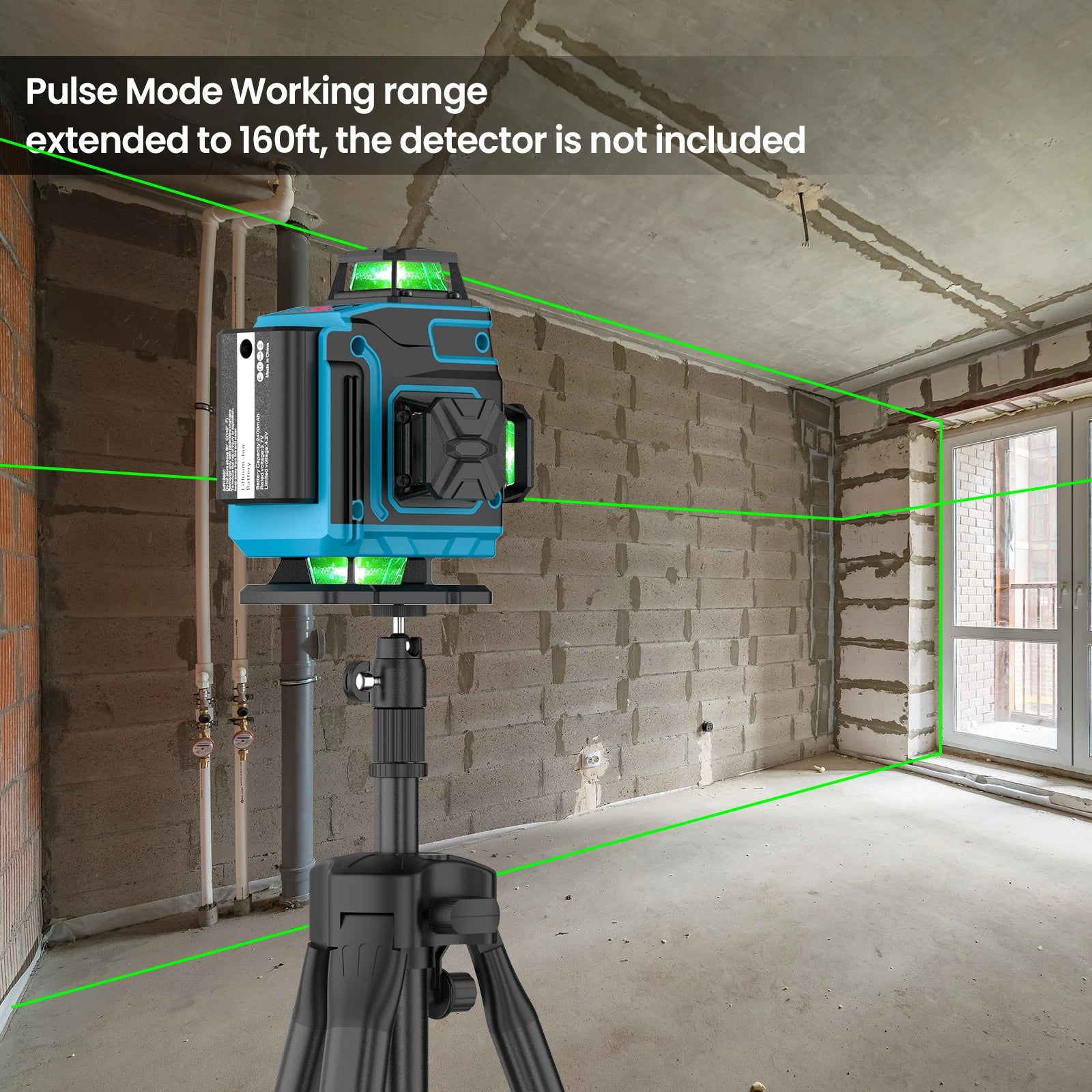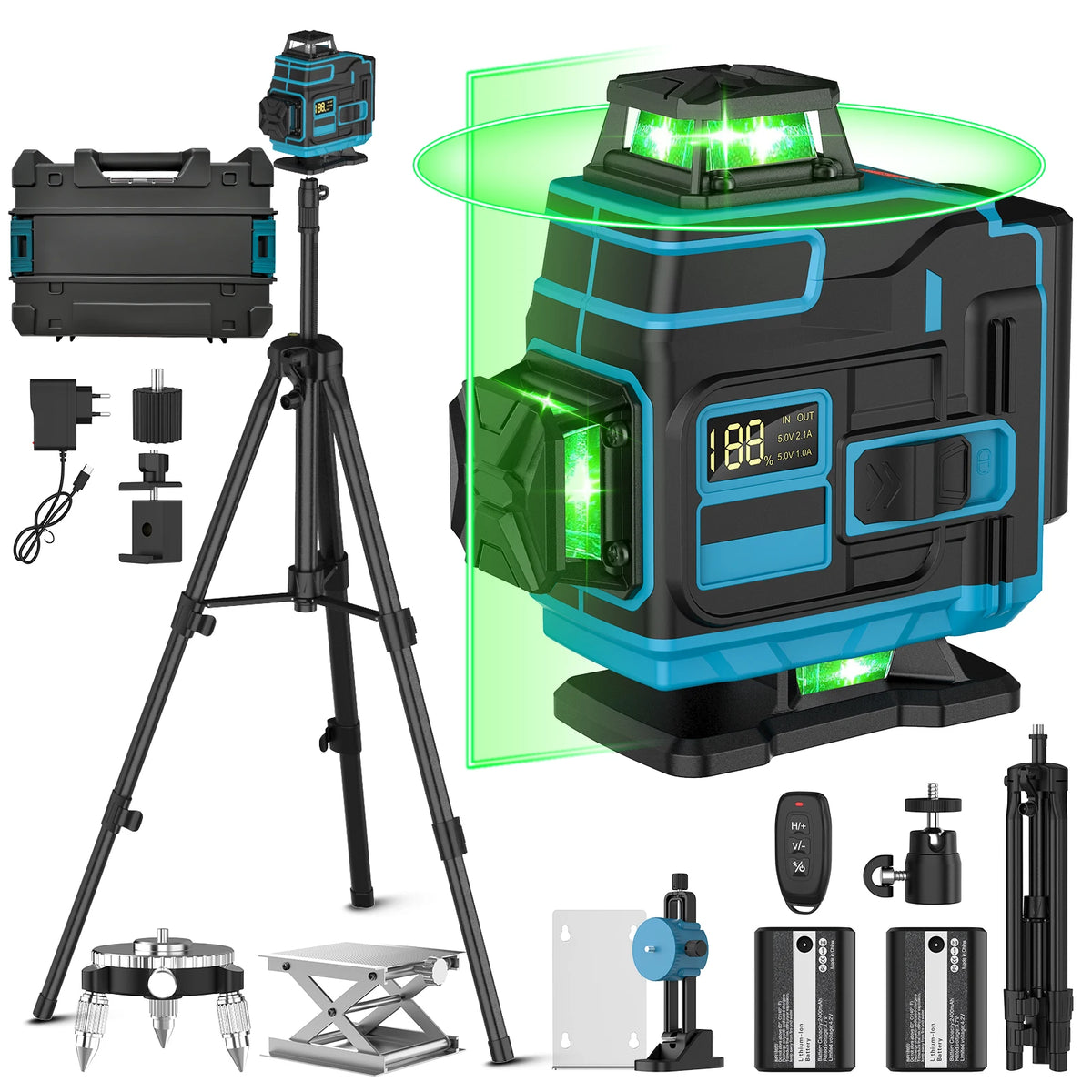 Achieve precise, effortless leveling with the 16 Lines Laser Level Self Leveling 360 Degree Tripod 1.2M from DWiusty. Four laser heads emit 360-degree lines, creating continuous loops on both horizontal and vertical planes for fast, accurate alignment on walls, floors, ceilings, tile, cabinetry, and more. The system is designed for stability and ease of use, featuring a robust 1.2m aluminum tripod with three adjustable heights, a bubble level to verify level, and a balance bar with a secure extension lock. Powered by two rechargeable lithium batteries, it delivers up to 5–6 hours of continuous operation, making it ideal for larger projects or daily shop tasks. With a laser wavelength of 505–520nm and Class 2 safety, this laser level provides reliable performance across a typical construction workspace. At intercyprus.com since 2002 — trusted for quality and reliability.