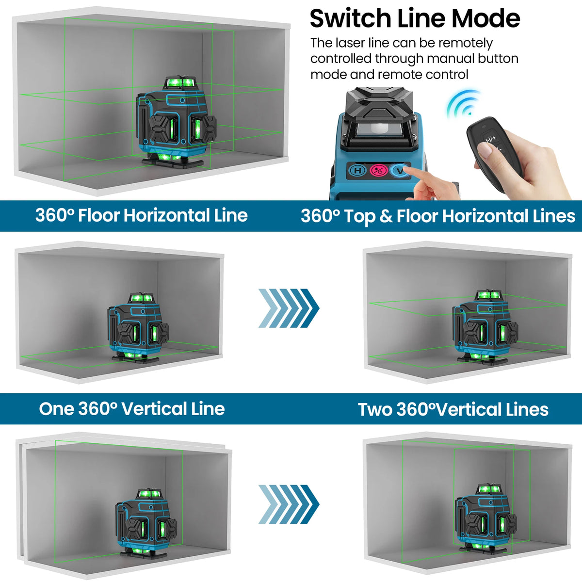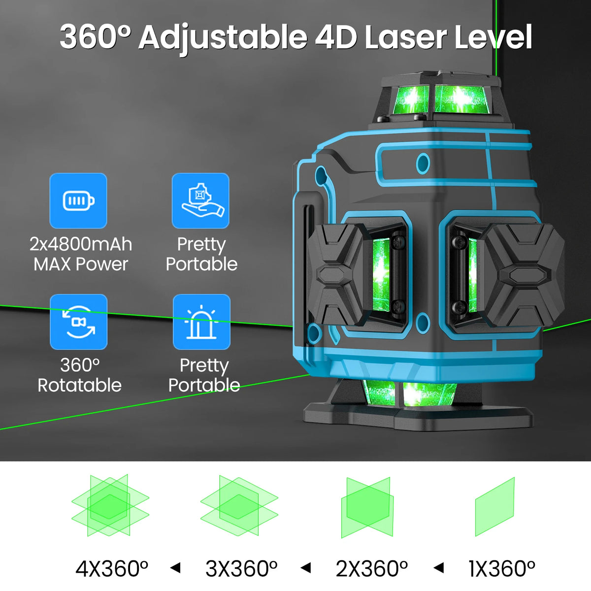 - Number of laser heads: Four lasers emit 360-degree lines, each forming a 360-degree loop
