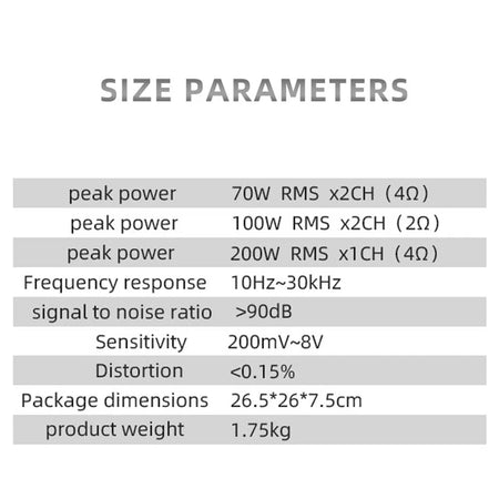 Powerful and compact, the ZUIDID 2-Channel Car Amplifier delivers serious punch for your car audio setup. This Class AB amplifier drives 2 x 70W into 2/4-ohm loads, helping you upgrade factory systems with clearer highs, richer mids, and deeper bass. The black aluminium alloy chassis not only looks sleek but also helps dissipate heat for reliable performance on long drives.